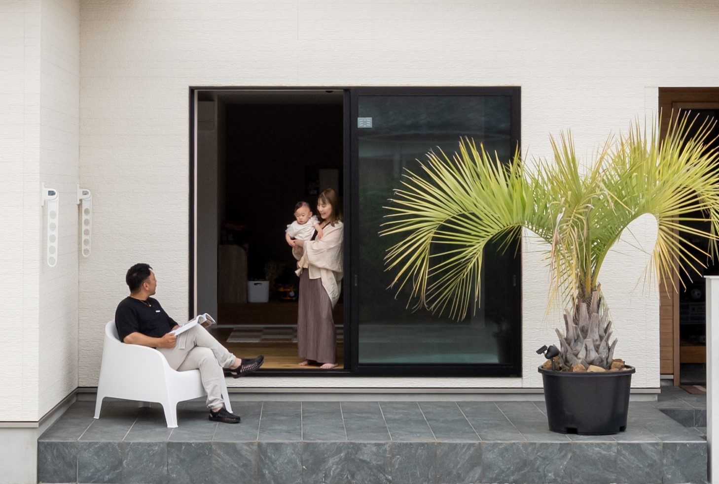 S様邸はご夫婦にお子さんの3人家族。記念にもなるからと快く写真に映ることを承諾して下さり、さっそく外観撮影からご協力して頂きました。本当は全景をご紹介したいところですが、それは雑誌が出来上がってからのお楽しみに。テラスの周りにはヤシの木やソテツといった南国系の植物が配置されているほか、過去ブログを見ても分かりますが、モダンが多いマイホームの中ではまた違った個性のある平屋です。