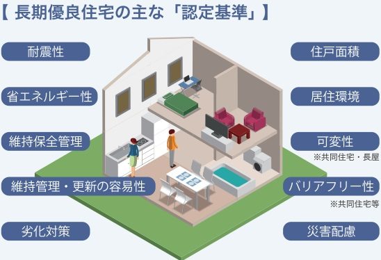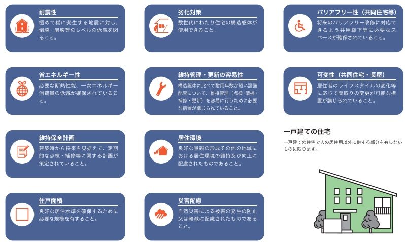 この5つとは、「A・長期に使用するための構造及び設備を有していること」「B・居住環境への配慮を行っていること」 「C・一定面積以上の住戸面積を有していること」「D・維持保全の期間、方法を定めていること」「E・自然災害への配慮を行っていること」。さらに細かく見ていくと、一戸建て住 宅の場合は9つの性能項目等が設けられ、それぞれに定められた基準をクリアすることが 求められています。