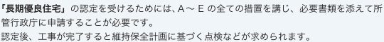 この5つとは、「A・長期に使用するための構造及び設備を有していること」「B・居住環境への配慮を行っていること」 「C・一定面積以上の住戸面積を有していること」「D・維持保全の期間、方法を定めていること」「E・自然災害への配慮を行っていること」。さらに細かく見ていくと、一戸建て住 宅の場合は9つの性能項目等が設けられ、それぞれに定められた基準をクリアすることが 求められています。