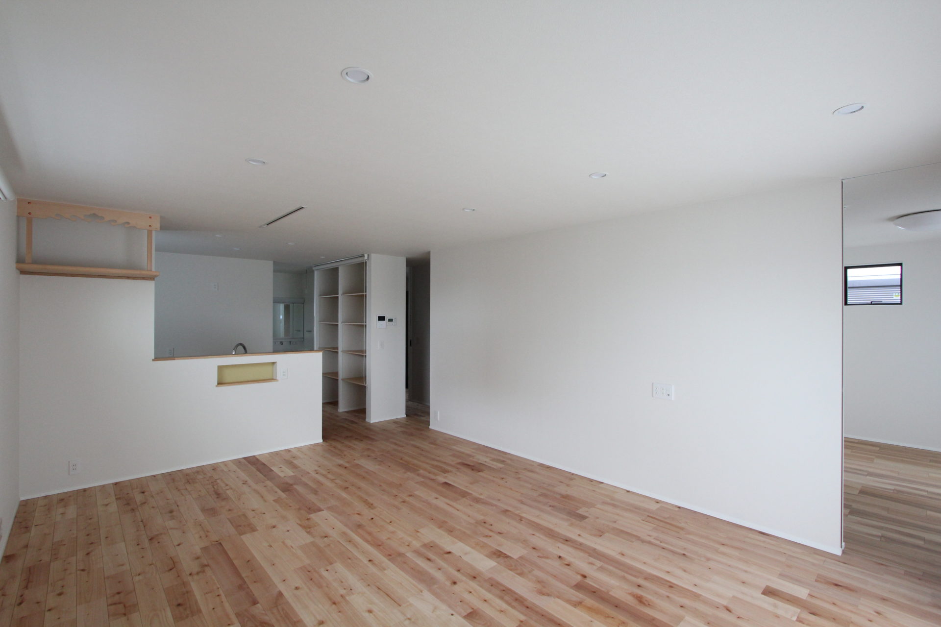 次はLDKのご紹介です。マイホームが標準仕様とするはオークの突板ですが、このM様邸は節のある木目と赤みのある独特の色合いが魅力のサクラを使用しています。壁や天井が白いので、よりサクラの床を引き立てていますね。また、キッチンには可愛らしい壁紙で彩られた大容量の収納棚が設けられています。