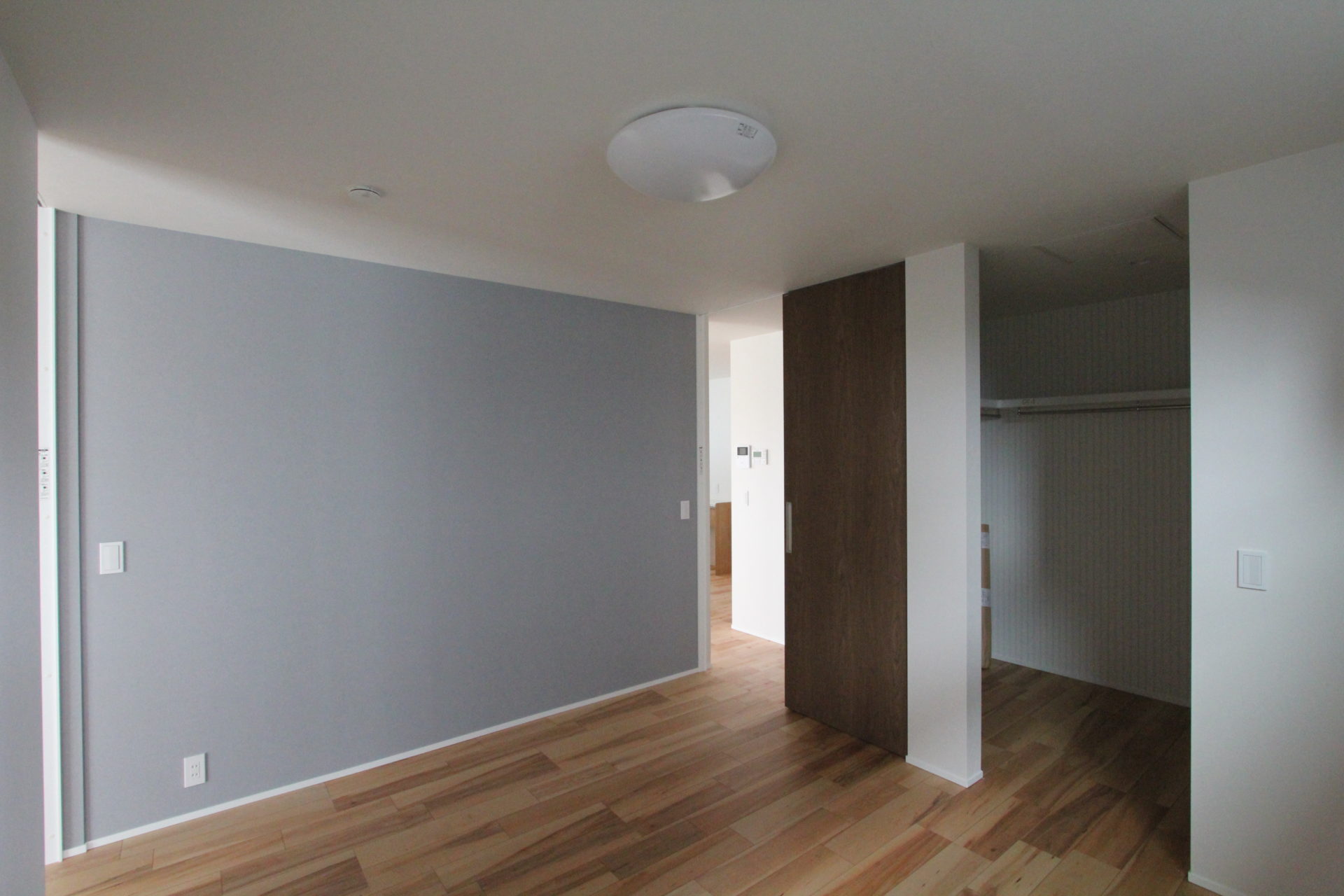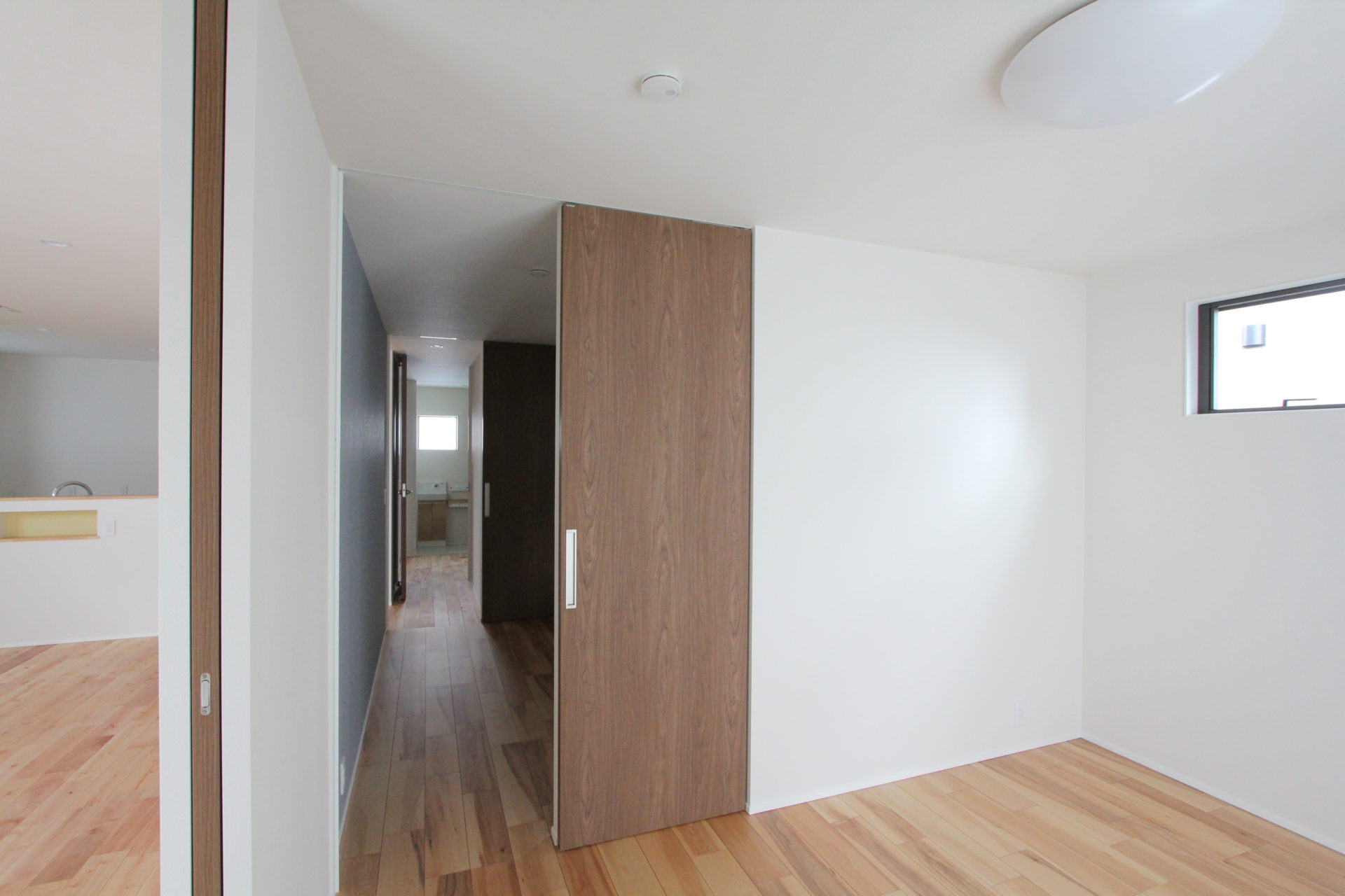 最後に寝室と、その奥にも洋室が位置しています。皆さんお気づきのように、このM様邸は行き止まりがなく、全ての部屋が通り抜けられて、かつぐるりと一周できる動線上に並んでいます。23坪というサイズを、さらにムダなく構成した間取りこそ一番の特長といえるのではないでしょうか。