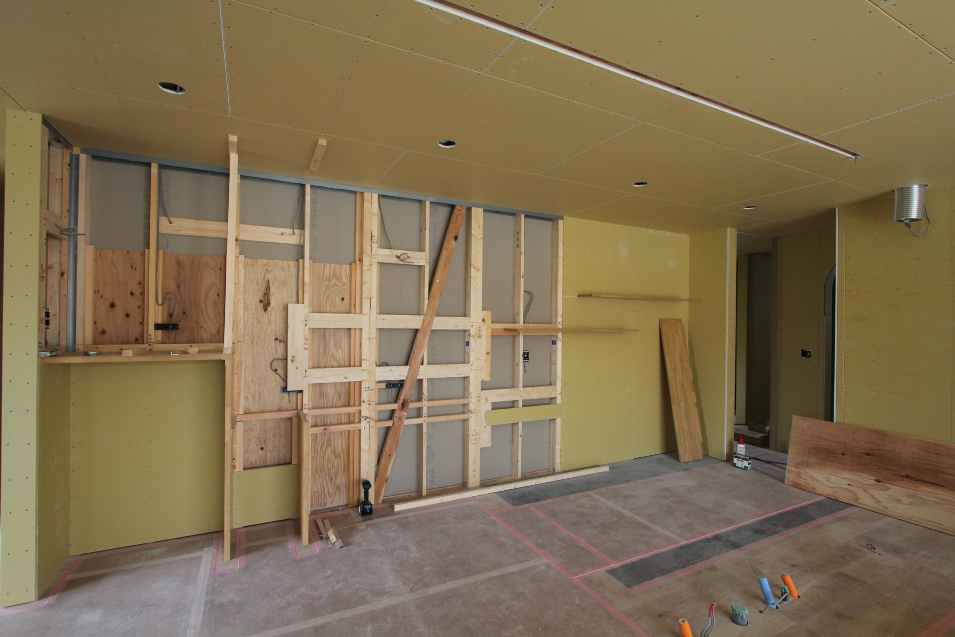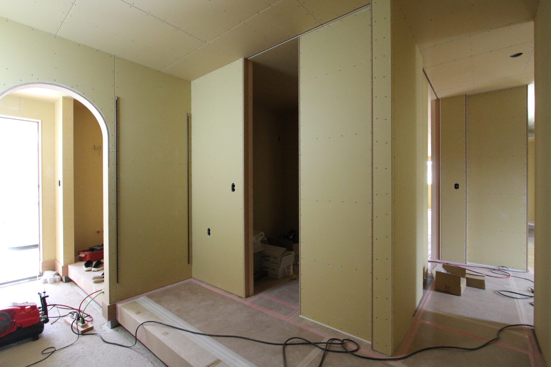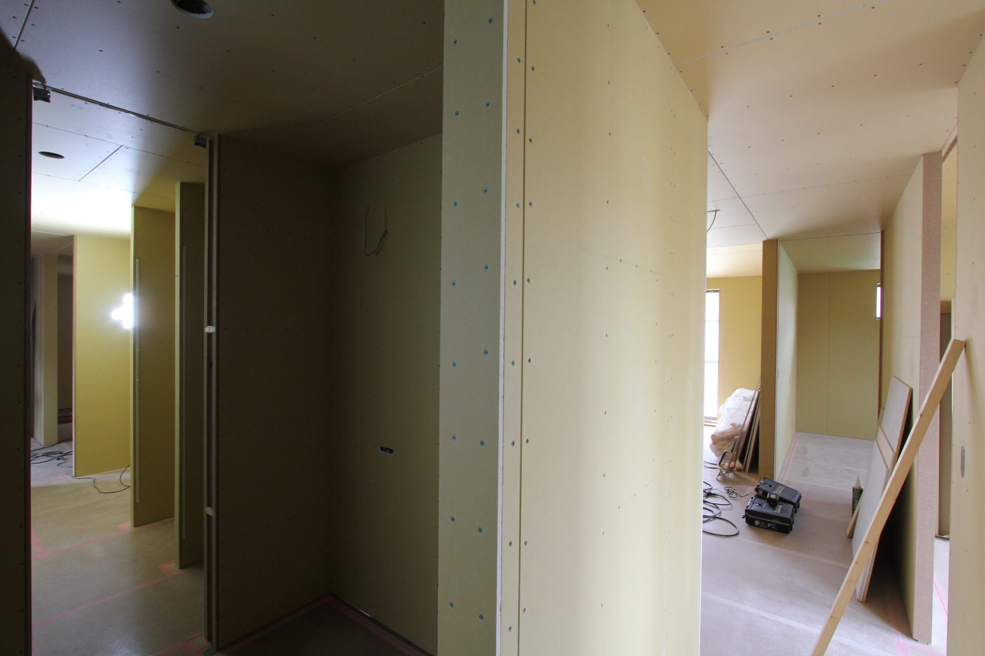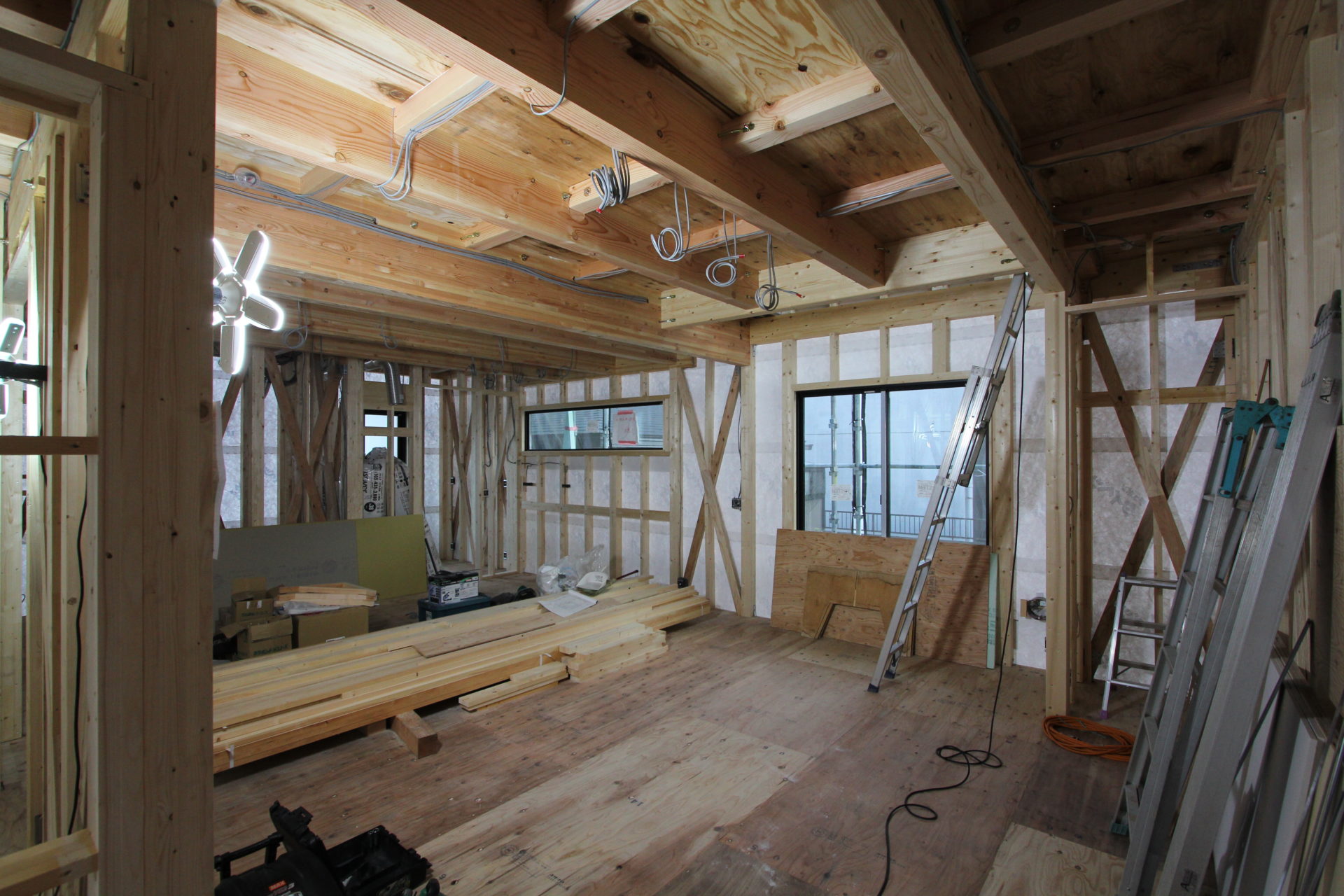 前回のブログで予告通りに足場が外れ、壁や軒天に現した木目調サイディングが印象的な、落ち着いたナチュラルな外観がお目見えに。そして、これも前回のブログで書きました「K様邸は間取りにも力を入れており、土間収納や洗面室も含めて、ぐるりと回遊できる動線になっているため、もう少し工事が進めば、より分かりやすくお伝えできるかと思います」のコメント。そうです、あれから順調に工事が進み、下の写真を見てもらえれば様々な空間が繋がっていることが分かるかと思います。玄関土間からはキッチンと各居室の2方向へ繋がるなど行き止まりがなく、マイホームとお施主様が試行錯誤を重ねた末に誕生した会心の間取りです。そしてLDKとなる空間では、もうすぐキッチンやカップボードが設置される予定です。
