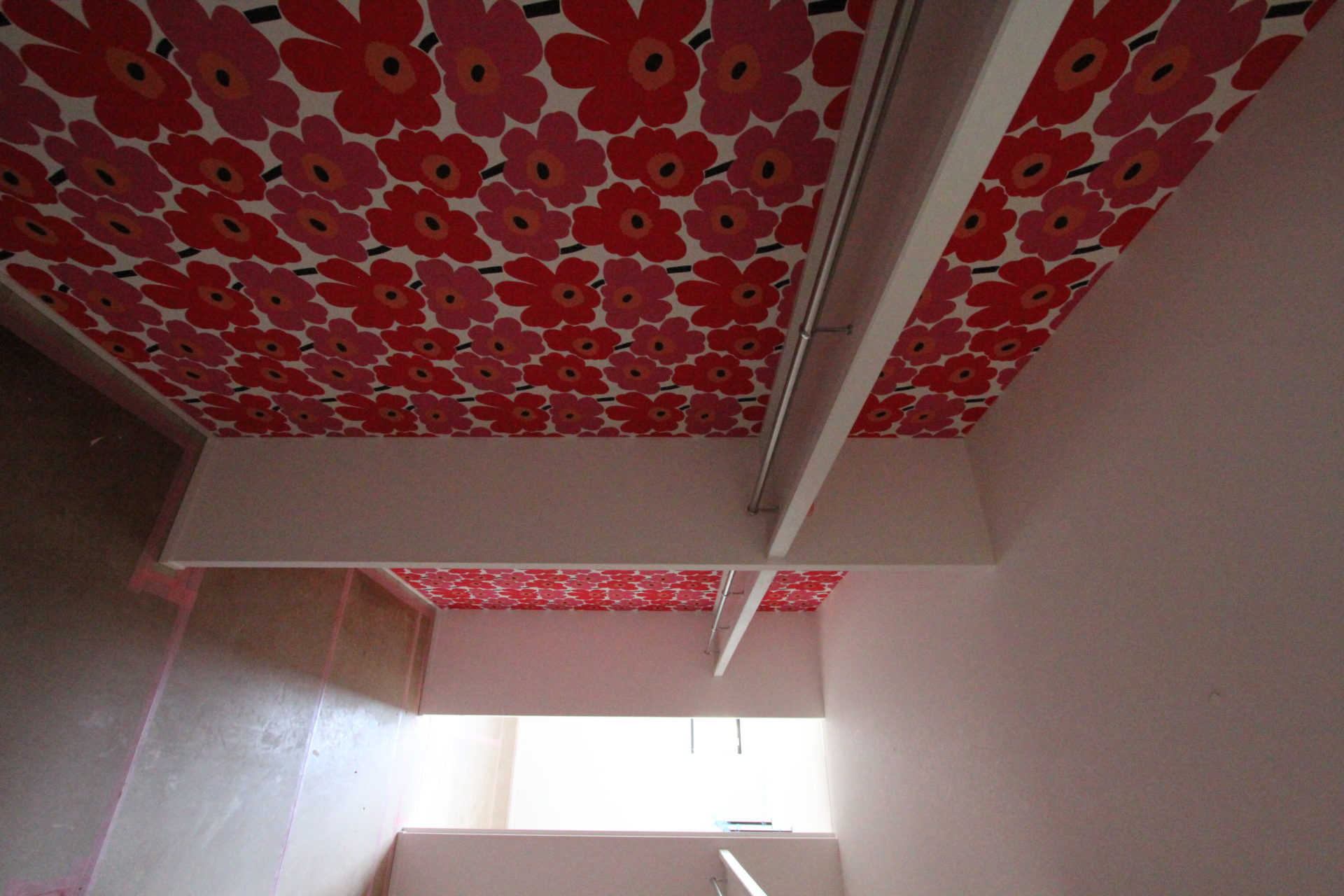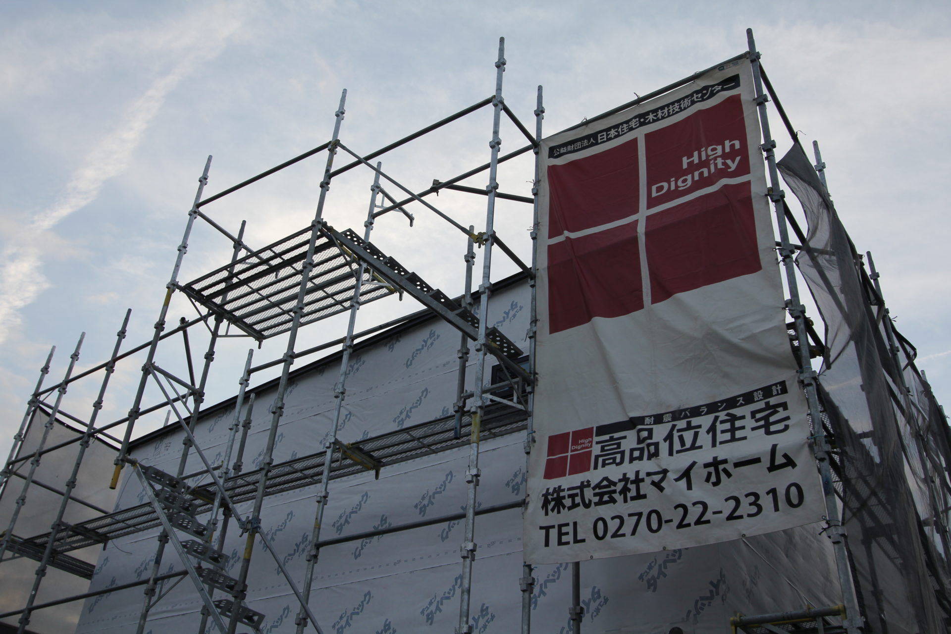 12月中旬のお引渡しに向けて、まさに「ラストスパート」といった感じで工事が進んでいる吉岡町のH様邸。外観を見てお気付きの方もいるかもしれませんが、近くに大きな川が流れていることもあり、基礎が少し高めに設計されています。室内は最後に天井のダウンライトを設置するための足場が組まれており、これを終えればクリーニング→完了検査でお引渡し…となります。玄関ホールと主寝室の間に位置するウォークスルークローゼットは、お施主様の「遊び心」を表現した鮮やかな花柄の壁紙が目を引きます。