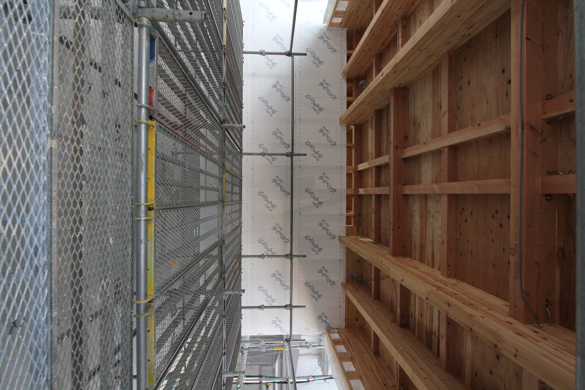 今回、初めてのご紹介となりますのが前橋市のM様邸です。マイホームでは久しぶりのオープンガレージのあるお住まいで、車2台が駐車できる広さを備えています。外観デザインはモダンなBOX型、翌月の「現場巡り」では外観パースをご紹介したいと思います。また、現場は上棟を終えた直後で、2階では大工さんが断熱材の施工を始めていました。コンパクトな吹き抜けには、足場用の枕木が掛かっています。とある地域の中心街にあるため、道行く人にマイホームの赤い幟がしっかりと目に留まっていることでしょう。「何か素敵な建物だな」そう思ってもらえたら嬉しいです(^^)