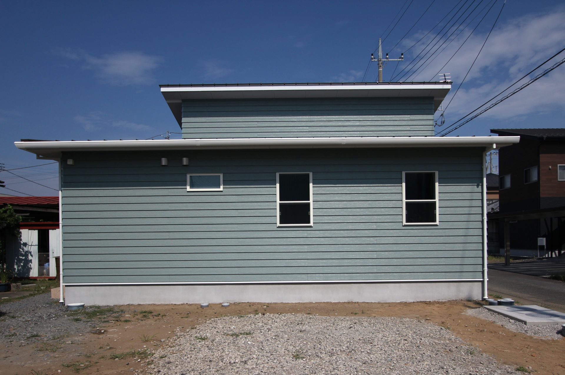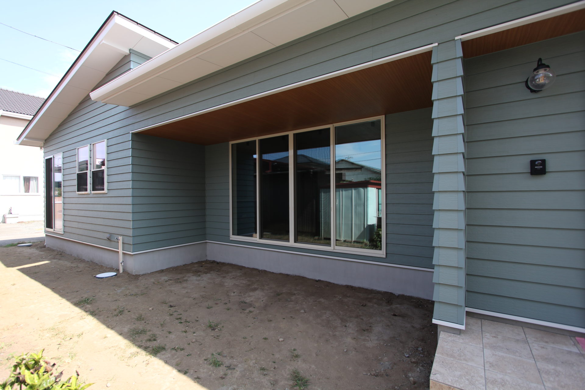 まずは、これまで小出しにしてきた外観のお披露目です。やや緑がかったグレーのラップサイディングのみでデザインした、平屋のサーファーズスタイル。隣家との距離が近いため南側は全景が撮れませんが、その形や雰囲気は充分に伝わるかと思います。