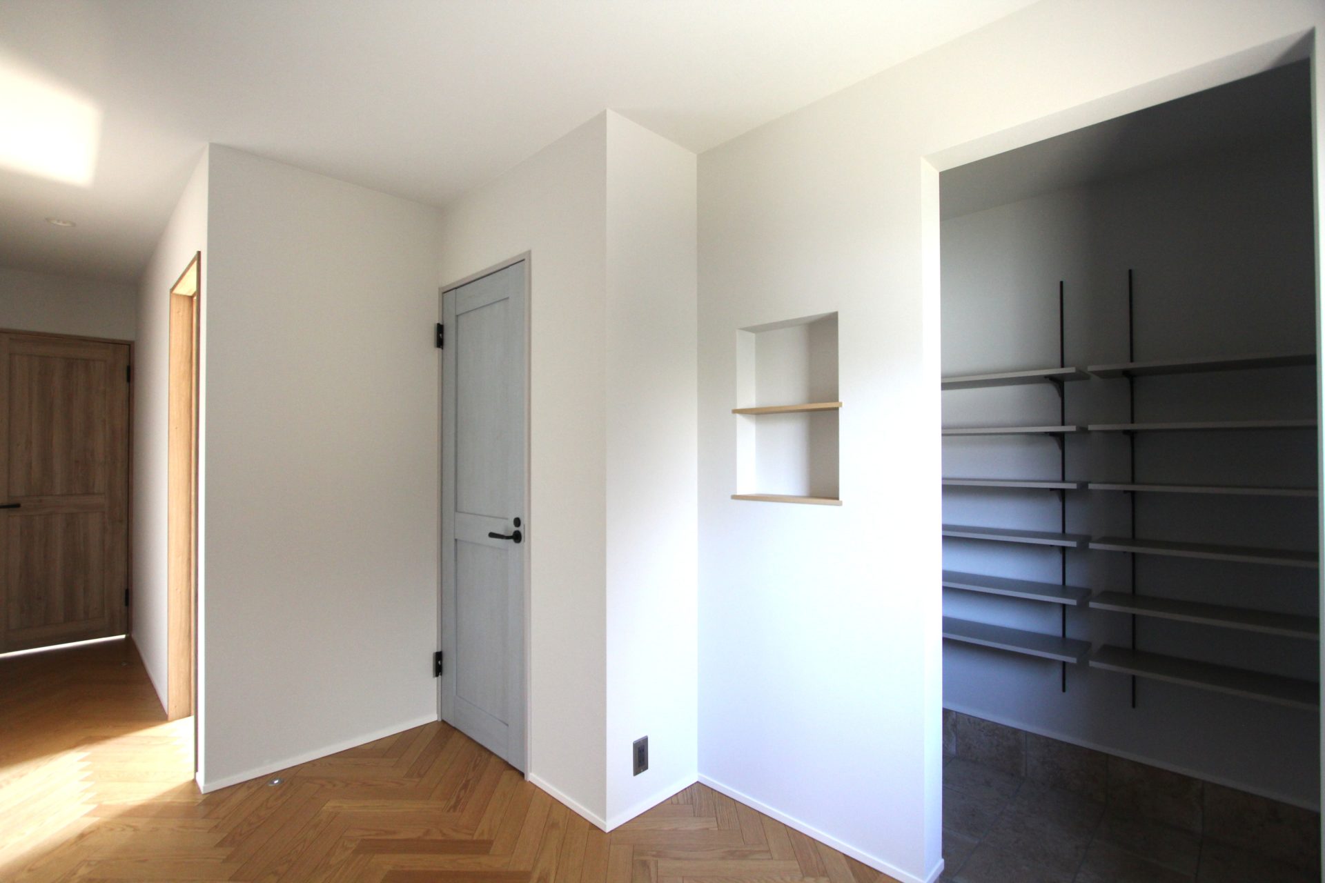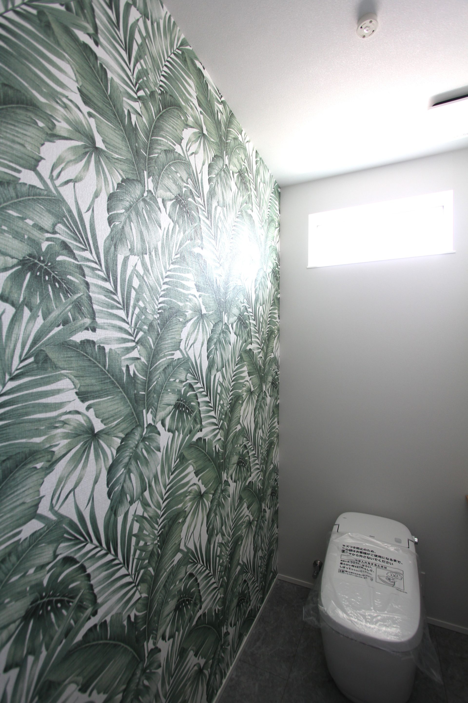 最後は、長方形の床材をV字に張っていく「ヘリンボーン」模様で表現した玄関ホールと、リラクゼーション効果を高めるべく壁一面にリーフ柄の壁紙を使用したトイレです。特に「ヘリンボーン」はとても手間のかかる作業のため、ハウスメーカーによっては対応できなかったり、代用としてヘリンボーン柄のフローリングを勧められるケースもあるでしょう。しかし、実際のヘリンボーンとフローリングでは雰囲気が大きく異なります。お客様が望む以上は、例え手間はかかっても全力で取り組む—それがマイホームの家づくりです。