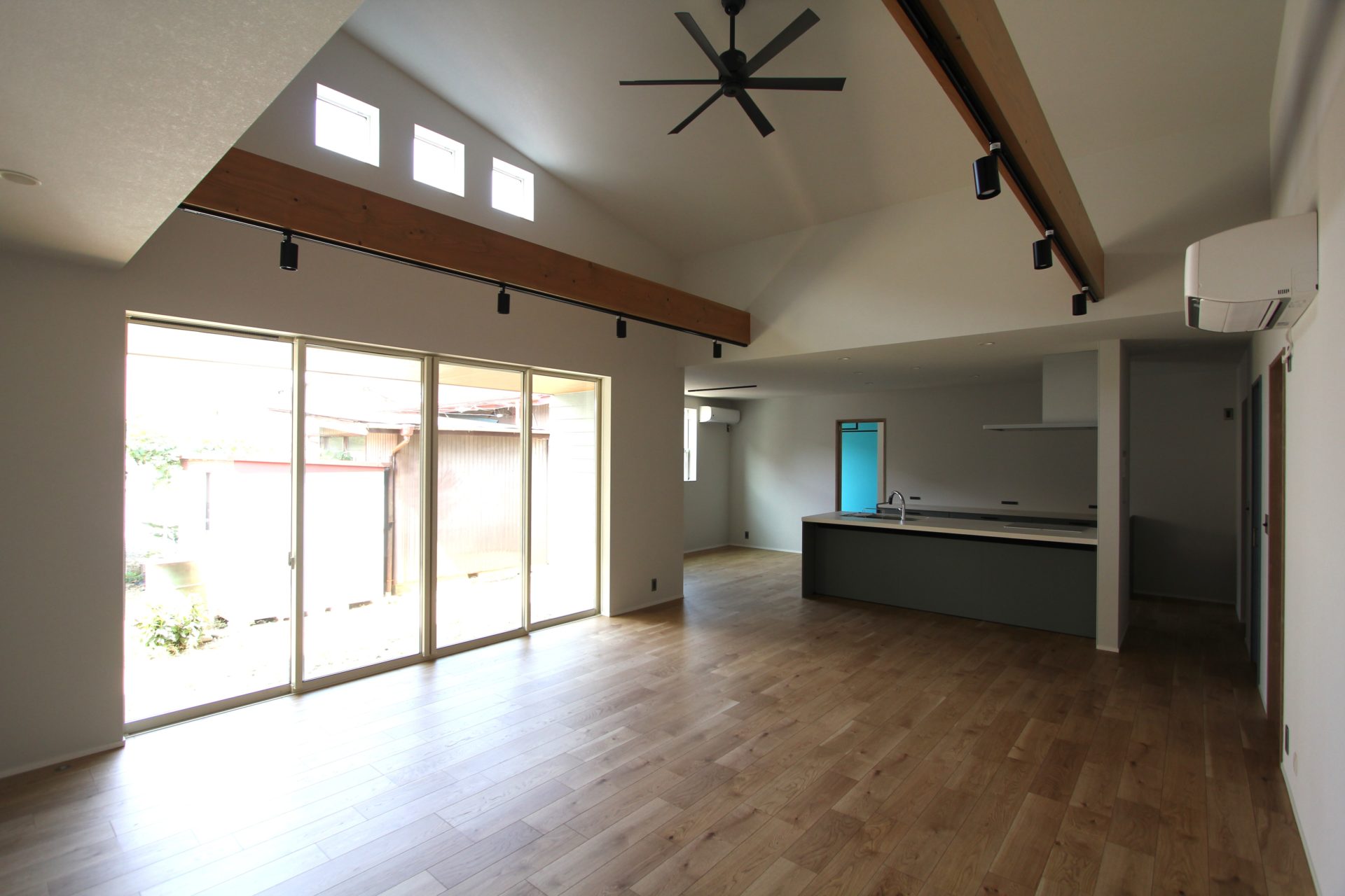 続いて開放感抜群のリビングです。すぐ南隣に家が建っていても採光が得られるよう天井高を確保して、さらにハイサイドライト(高窓)が設けられています。中庭との行き来を容易にするための、連続した2つの掃き出し窓も視線が外に抜けやすくなるため、より開放感が増すでしょう。