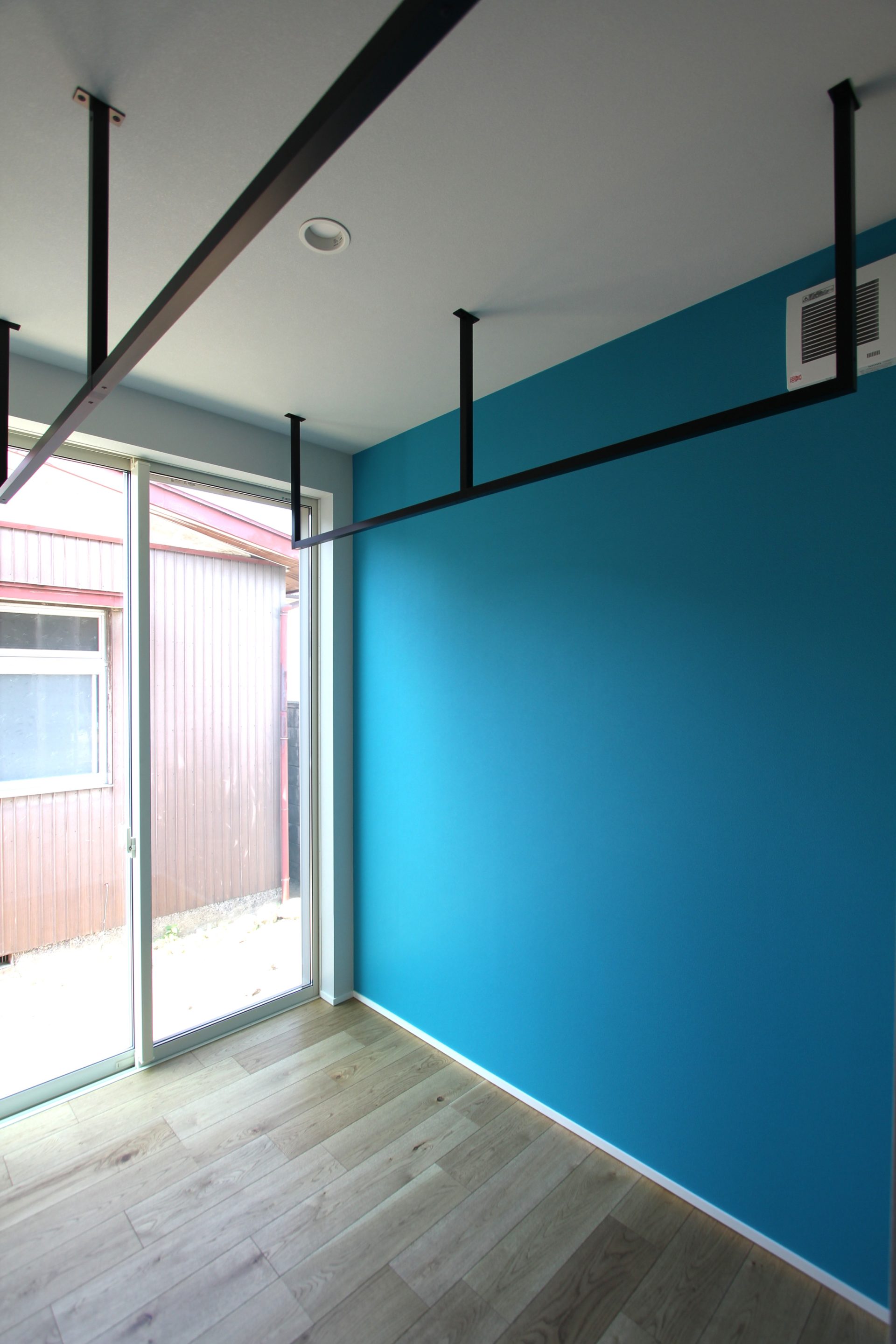 さらに、その南隣には自然と爽やかな気持ちになれるよう、鮮やかな青色の壁紙で雰囲気を大きく変えたランドリールームが続きます。洗濯物を干す場所だからこそ、清潔感や明るさはとても大切ですよね。ハンギングバーも2本、設置されているため洗濯物がたくさん干せます。