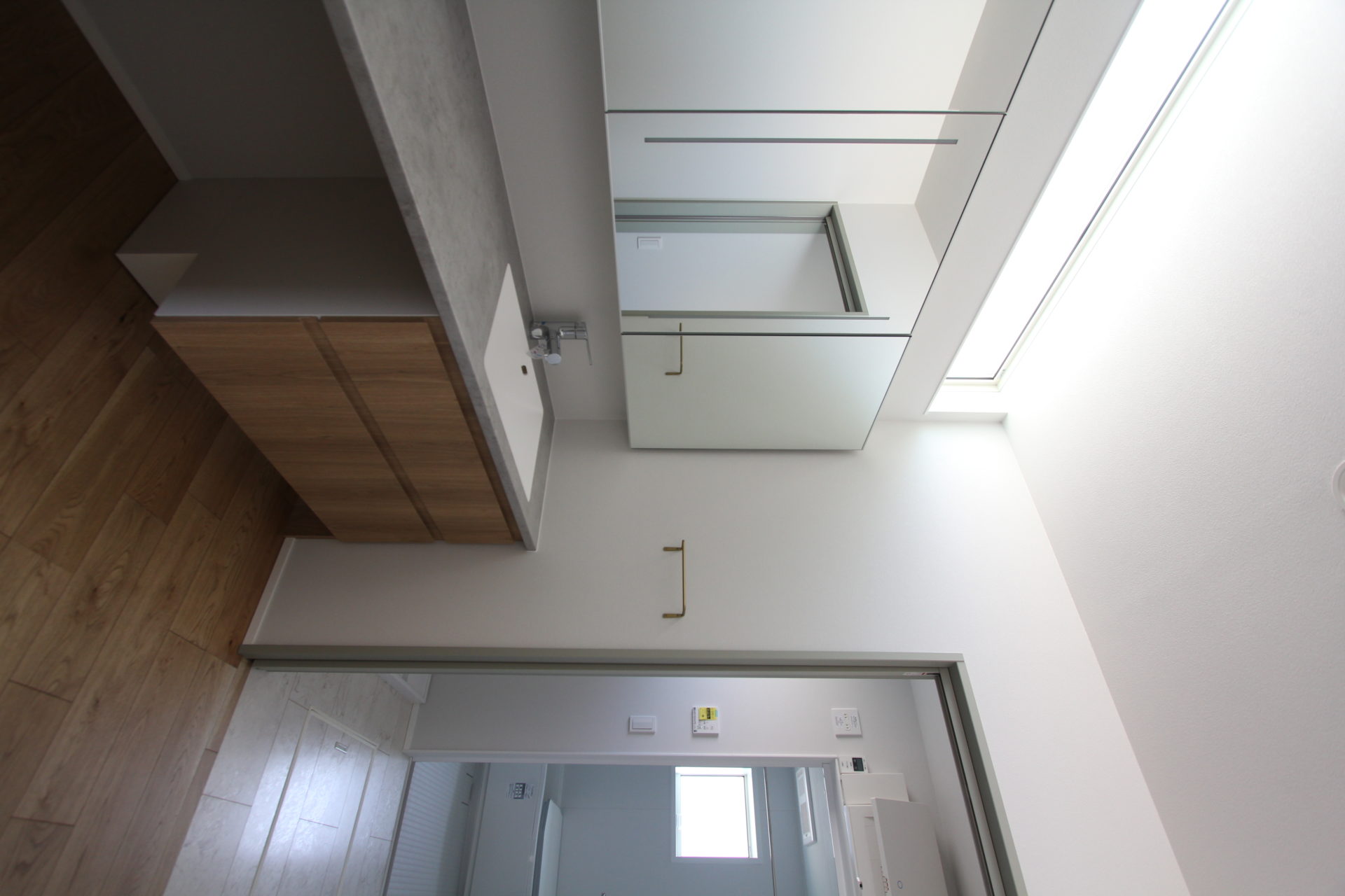 そしてLDKのすぐ西側に位置するのが洗面台。朝の慌ただしい時間帯でも、ご家族が並んで歯磨きしたり髪の毛を整えたりできるよう三面鏡を設置したほか、あえてシンクを右側に寄せることで、左側の空いたスペースを奥様のメイクスペースや物置きとして活用できるでしょう。