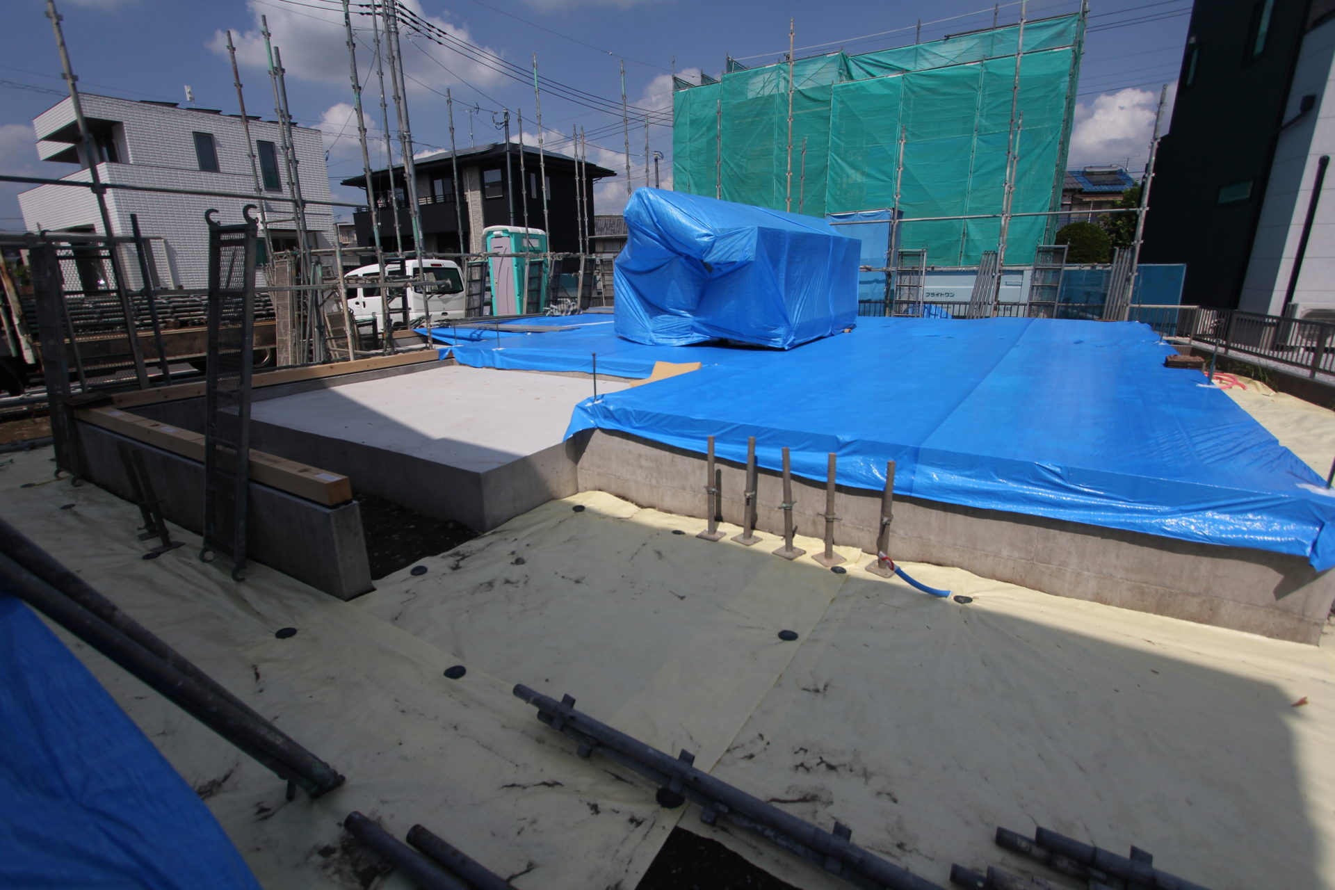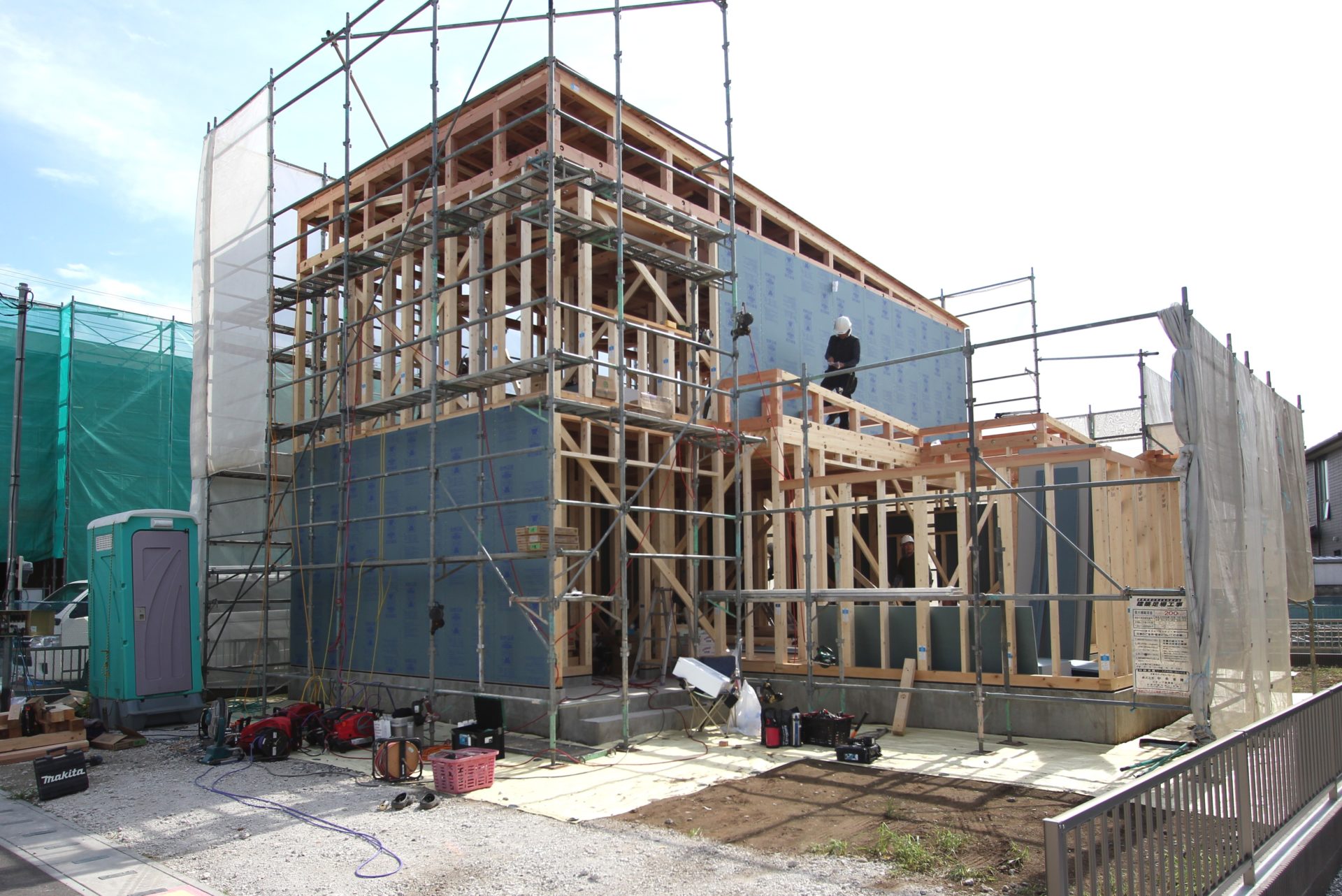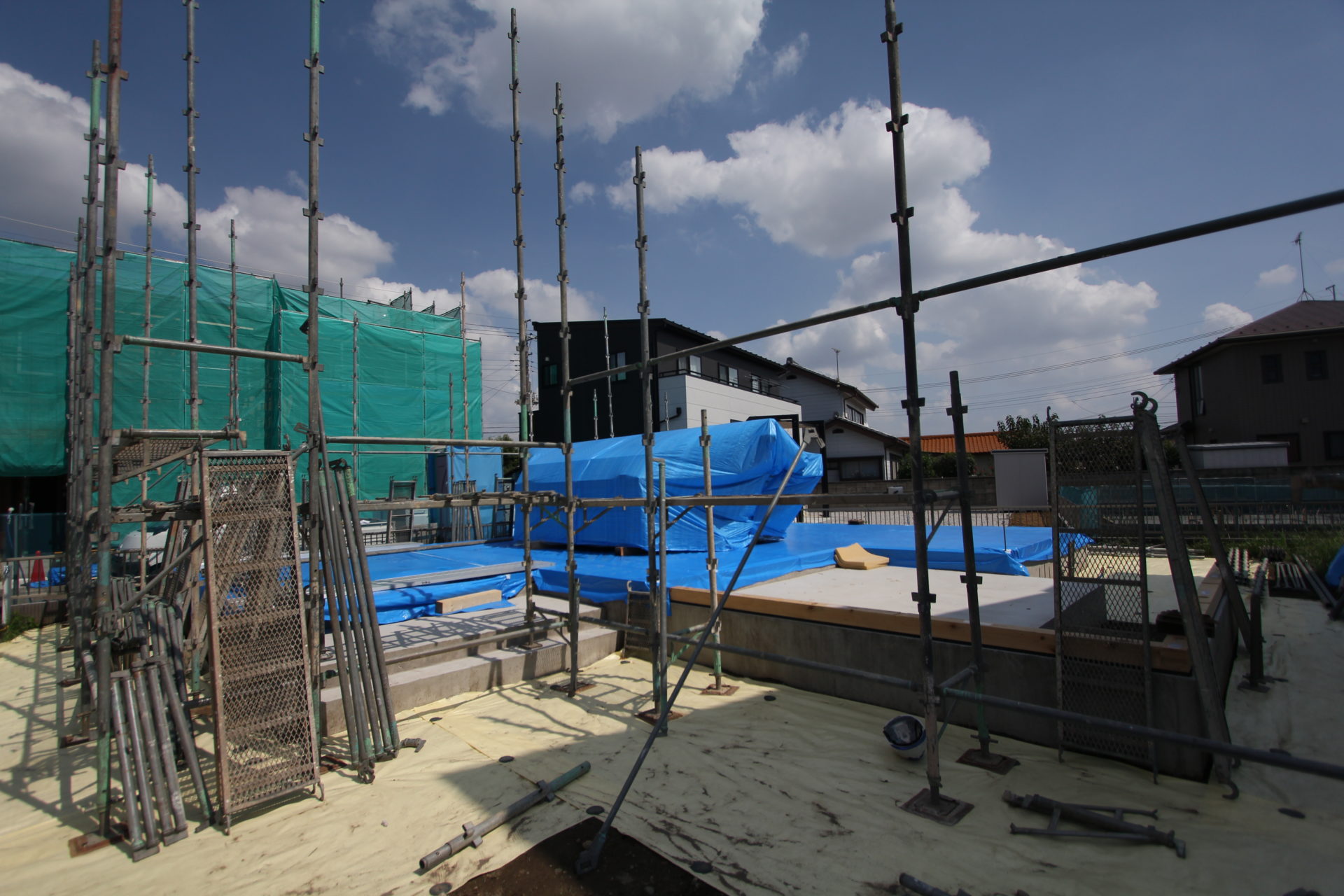 最初に伺ったのは上棟日の前日です。現場は5~6区画ほどある分譲地の一角。ちょうど2人の職人さんたちが上棟に合わせて足場を組んでいるところでした。暑さのピークを過ぎたとはいえ、この日の気温は35℃。まだまだ油断はできません。トラックには沢山の機材が詰まれていたほか、急なゲリラ豪雨に備えてのブルーシートによる養生も完璧です。