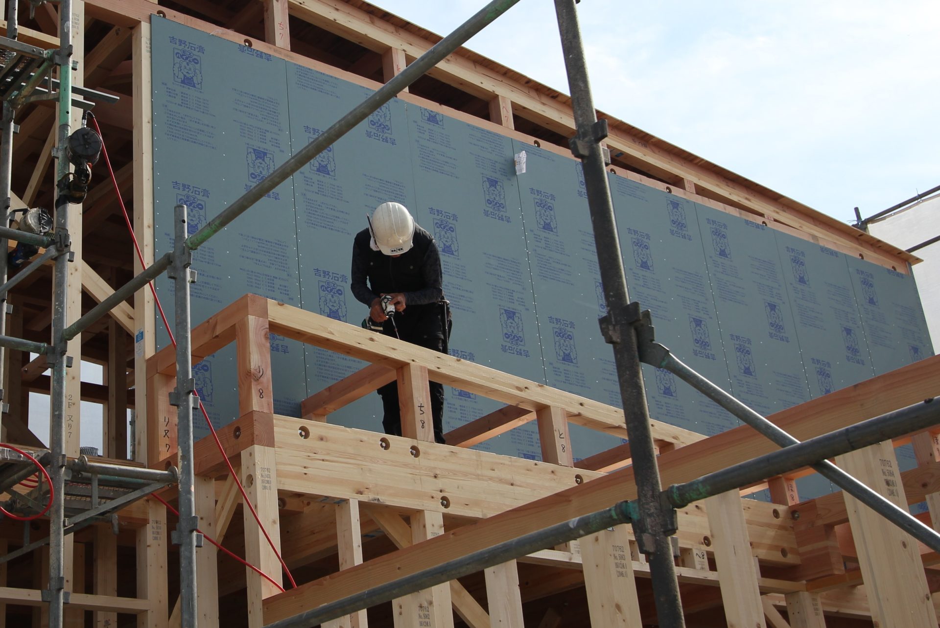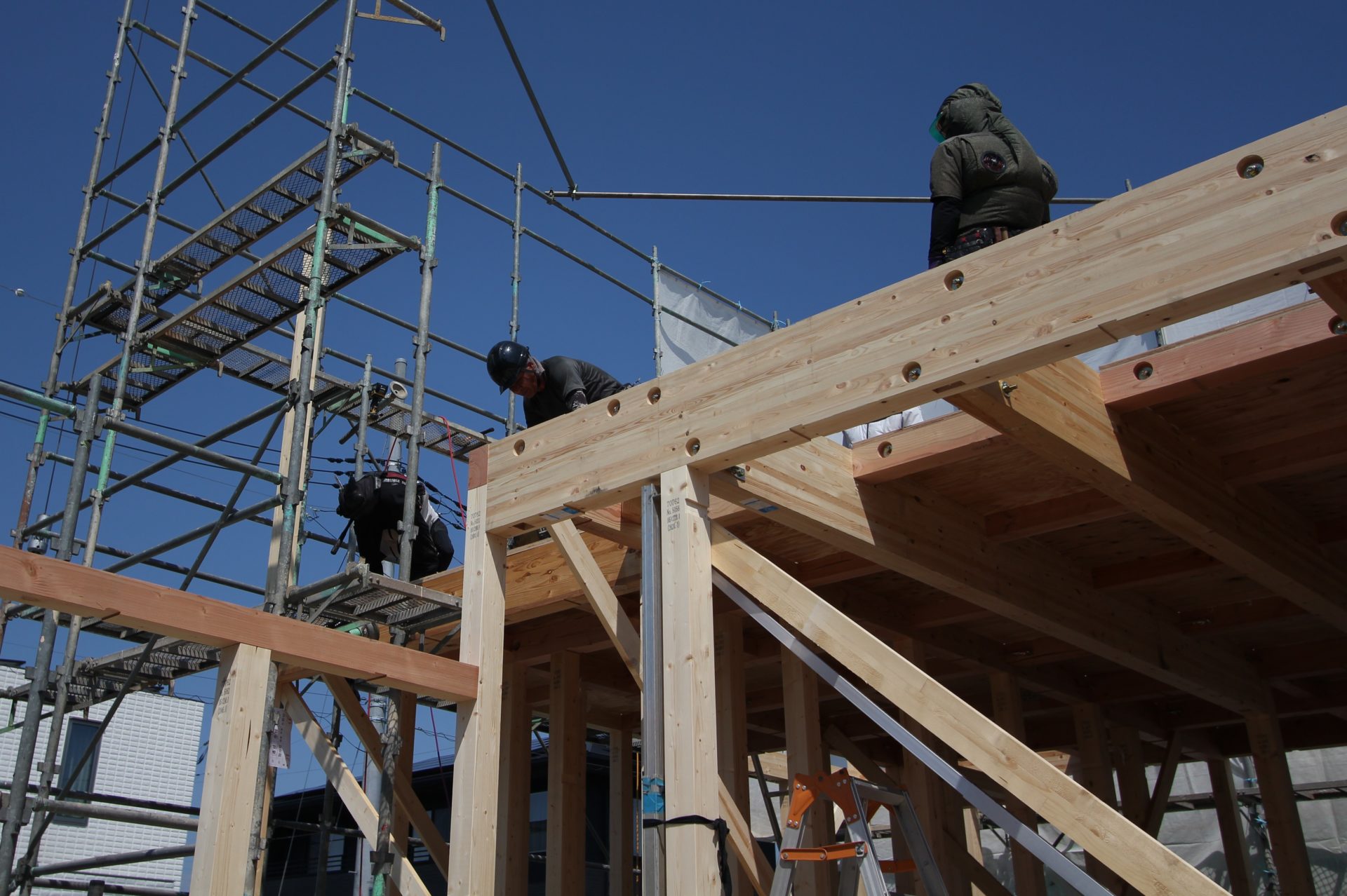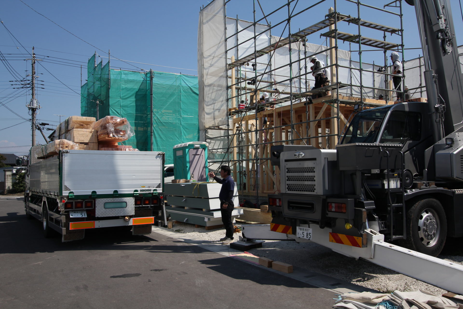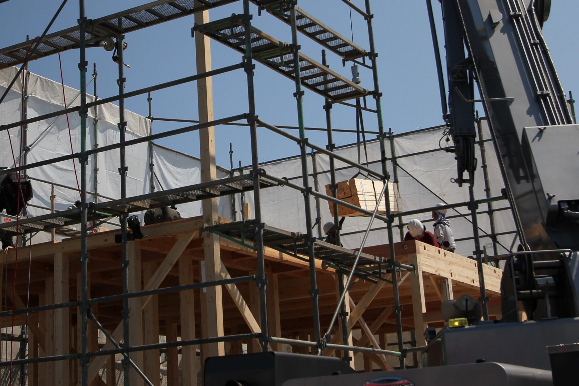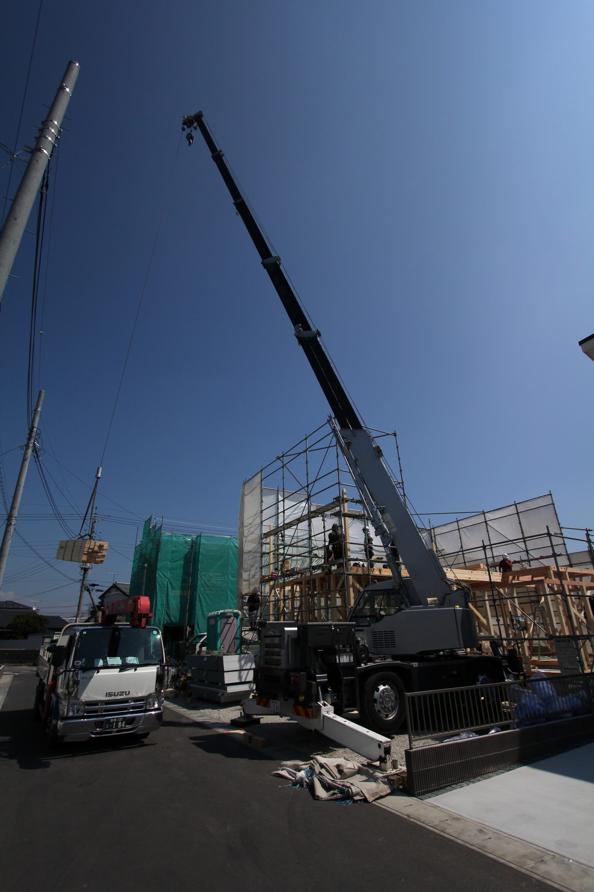 そして翌日は雲一つない晴天。ちょっと暑いかもしれませんが、思わずテンションが上がるほどのキレイな青空です。私が現地に着いたときにはすでに2階に着手していて、クレーン車がトラックに積まれた木材の束を運んでいるところでした。