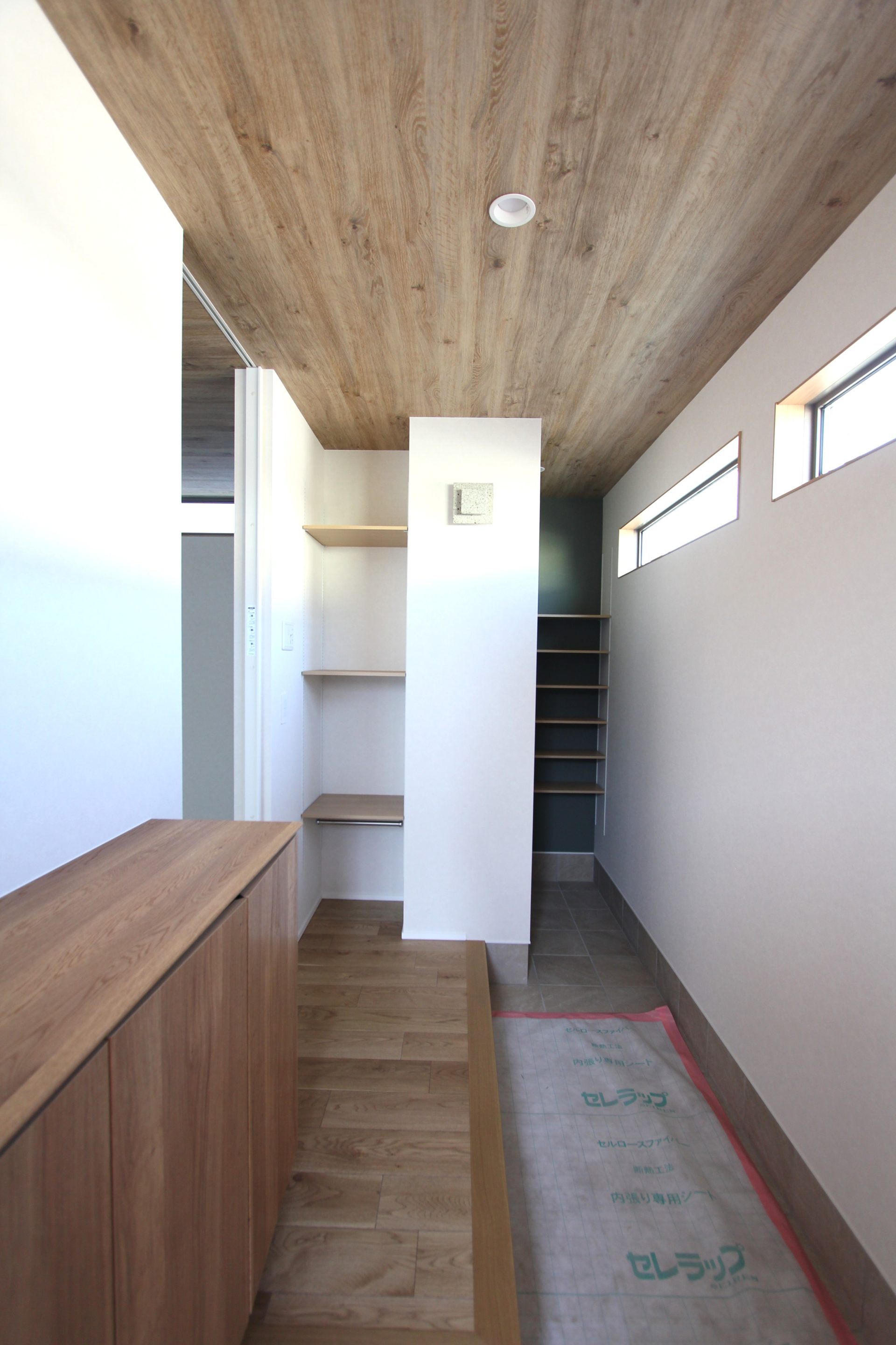 最後は玄関ホールです。土足のまま行き来できる土間収納は、現代の家づくりにおいて「あったらいいな」を超えた、もはや「必須」ともいえる空間です。また、グリーンの壁紙がアクセントになっています。