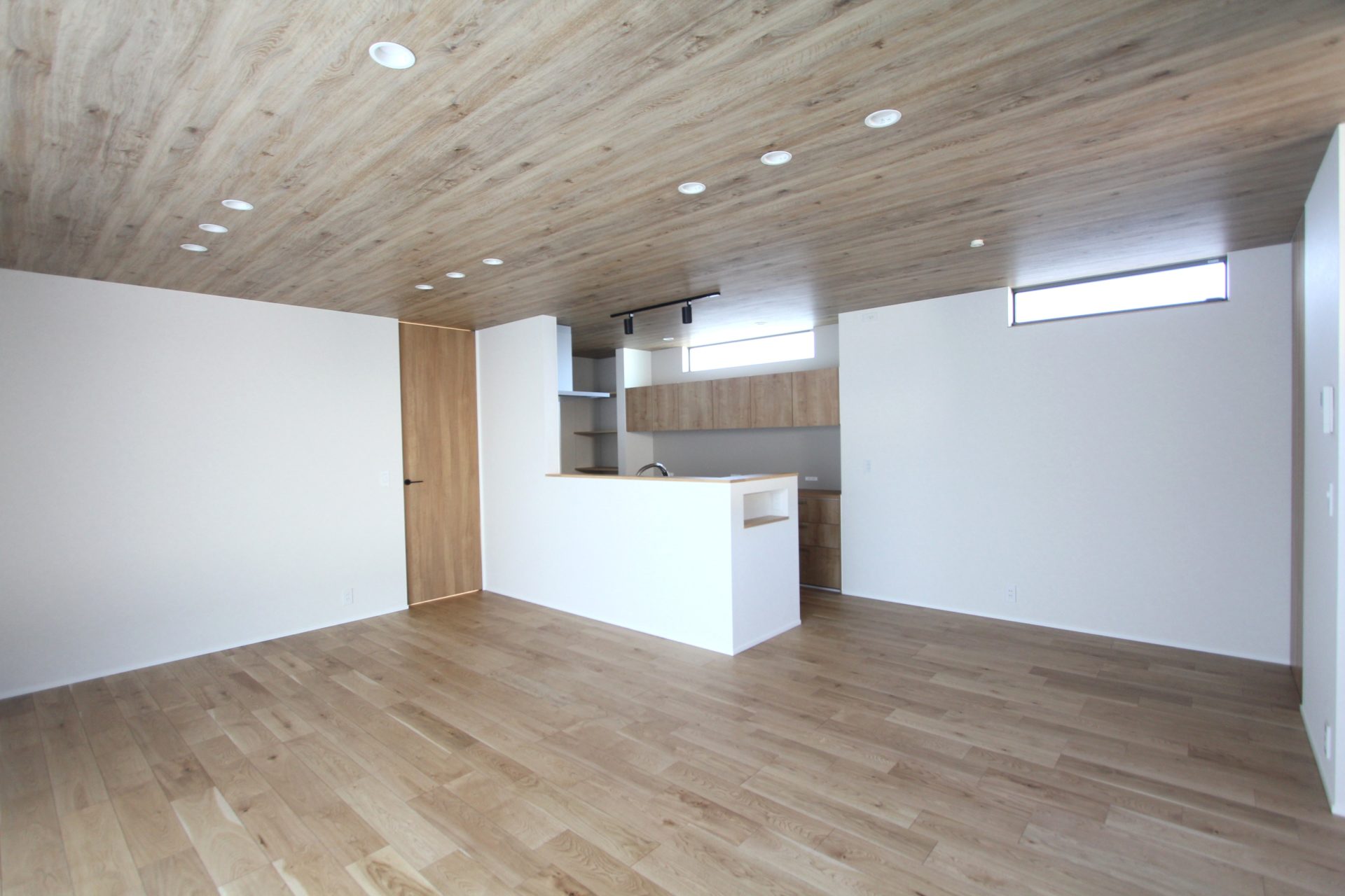 室内はナチュラル基調。床はオークの突板で、天井や扉にも木目柄を使用することで、見た目にも「木の温もり」にあふれています。派手な色、奇抜な色も素敵ですが、こういった老若男女を問わず、何歳になっても心が落ち着く、癒されるデザインもオススメです。