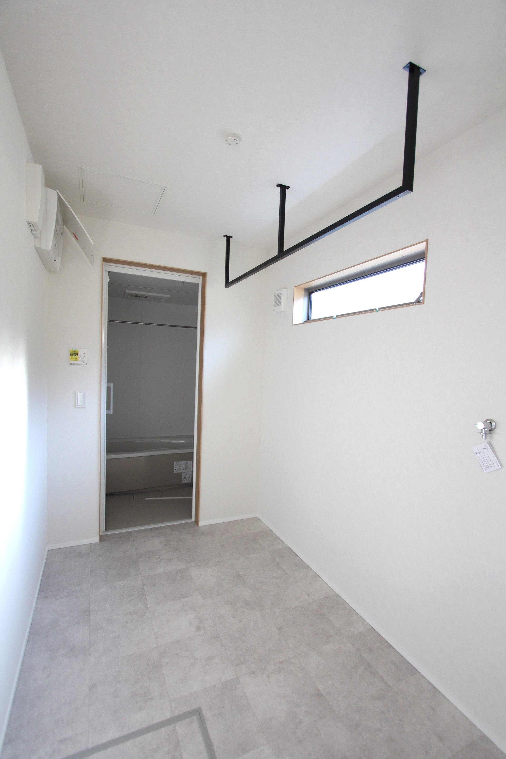 室内干しもできるようハンギングバーを設置した脱衣室は、見た目にも爽やかなホワイトでコーディネート。北側に位置していますが、僅かに差し込む陽の光でも充分に明るく感じられます。