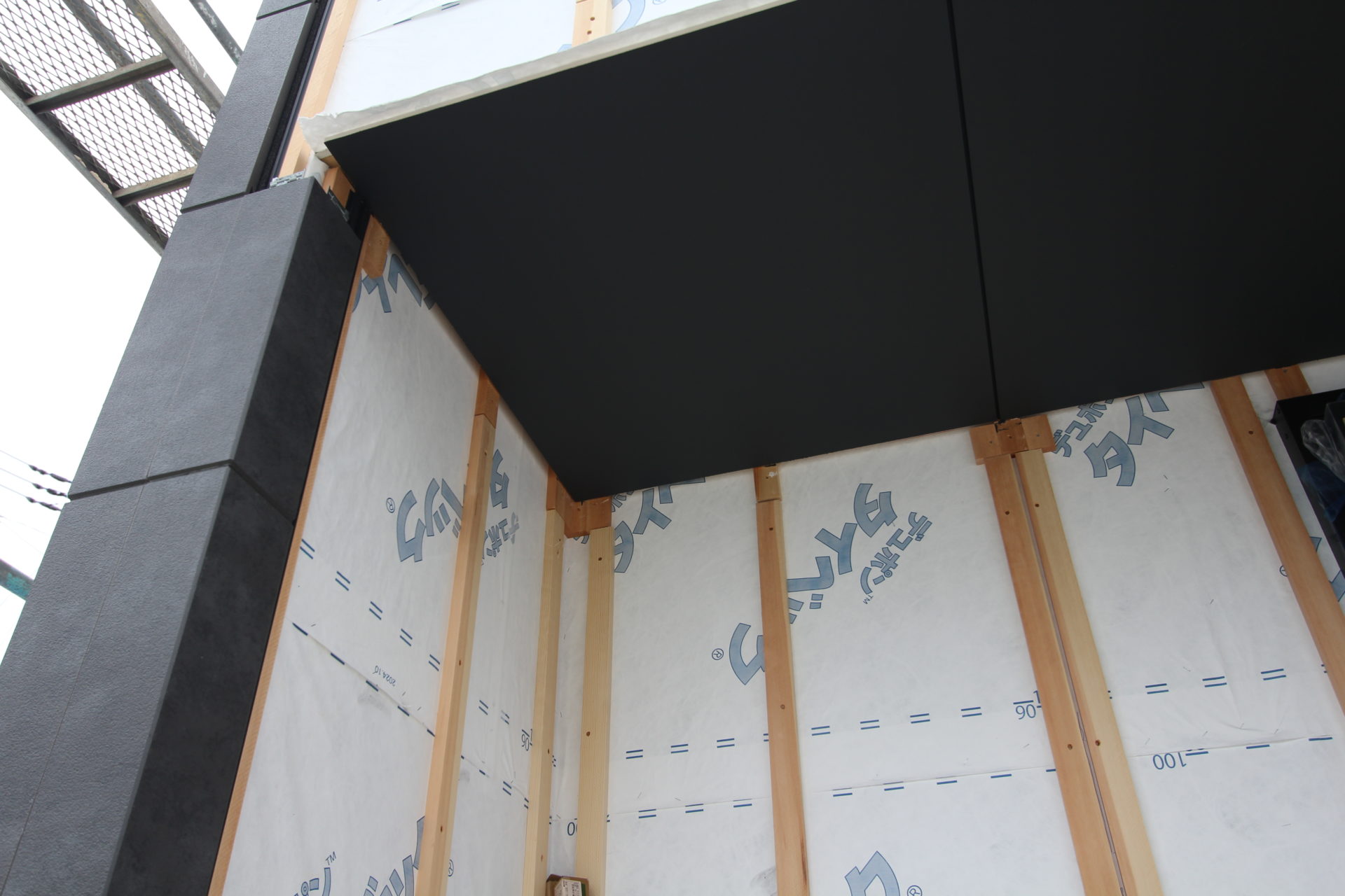 まずは外観ですが、まさにサイディング工事が始まったばかりです。建物の角やエントランスの天井部分など一部には既に黒いサイディングがお披露目されていました。
