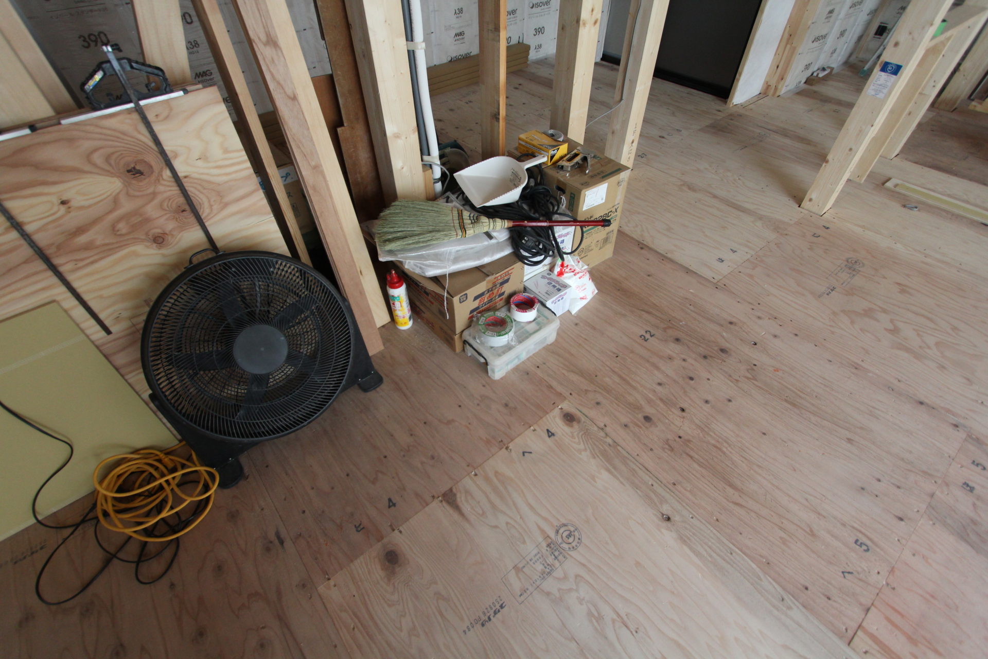 室内に入ると、まずは整理整頓された現場のキレイさに驚きました。この日の大工さんは2階で作業されていたので、私が訪れたときは1階には誰もいない状態でしたが、木屑一つすら落ちておらず、モノは1か所にきちんと集められていました。普段は玄関で靴を脱ぎ、スリッパを履いて邸内を歩き回るのですが、「そのスリッパすら不要なのでは?」と思ったほどです。単に腕が良いとか、丁寧に仕事をするといったことも大切ですが、お施主様の大切なお住まいである以上は、「整理整頓」も絶対に欠かせません。現場のキレイさによって、工務店の家づくりに臨む姿勢そのものが問われているとマイホームは考えています。