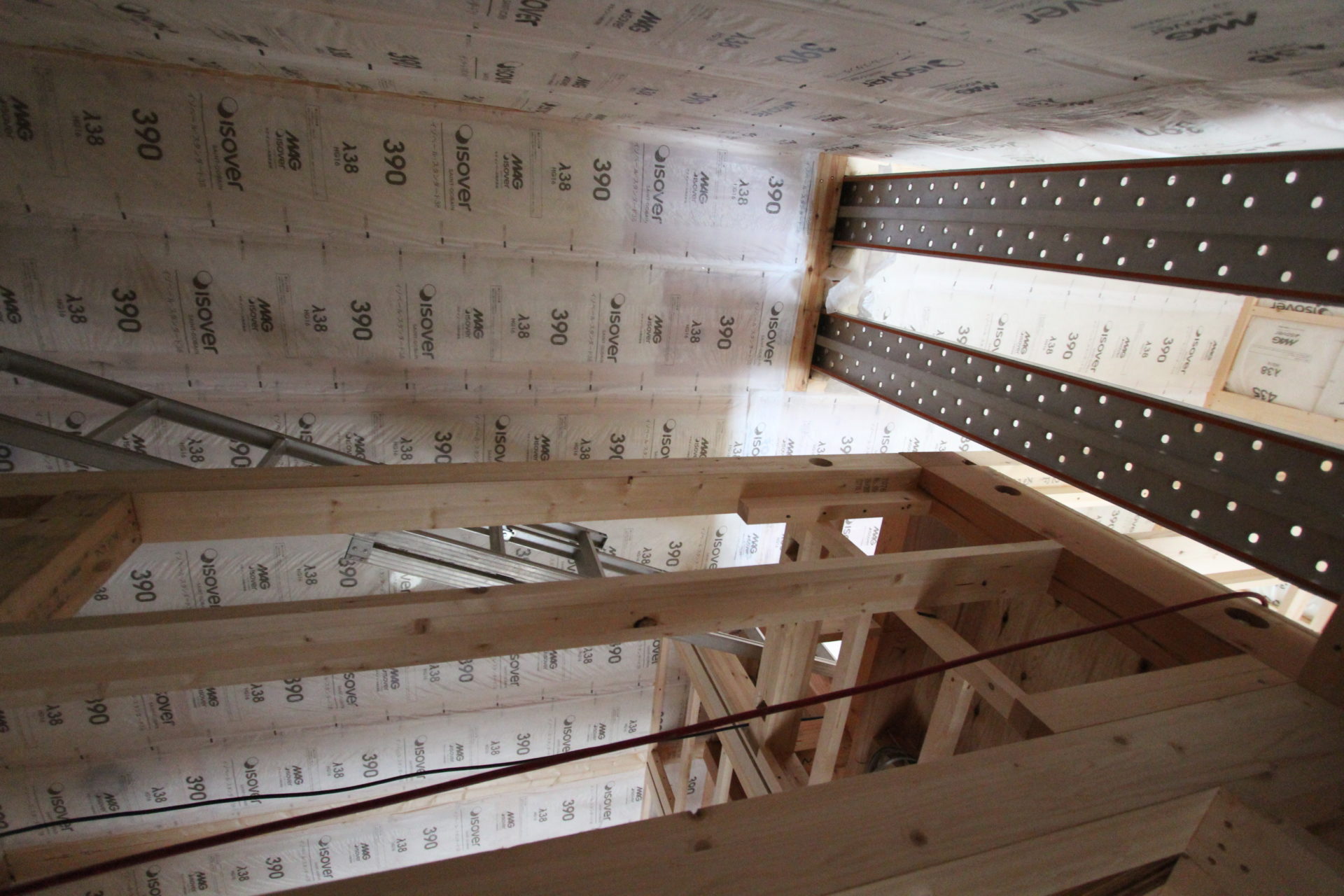 レンジフードに繋がるダクトを見ても分かるようにキッチンと、その北側に隣接する浴室になります。室内はあっという間に断熱工事まで完了です。