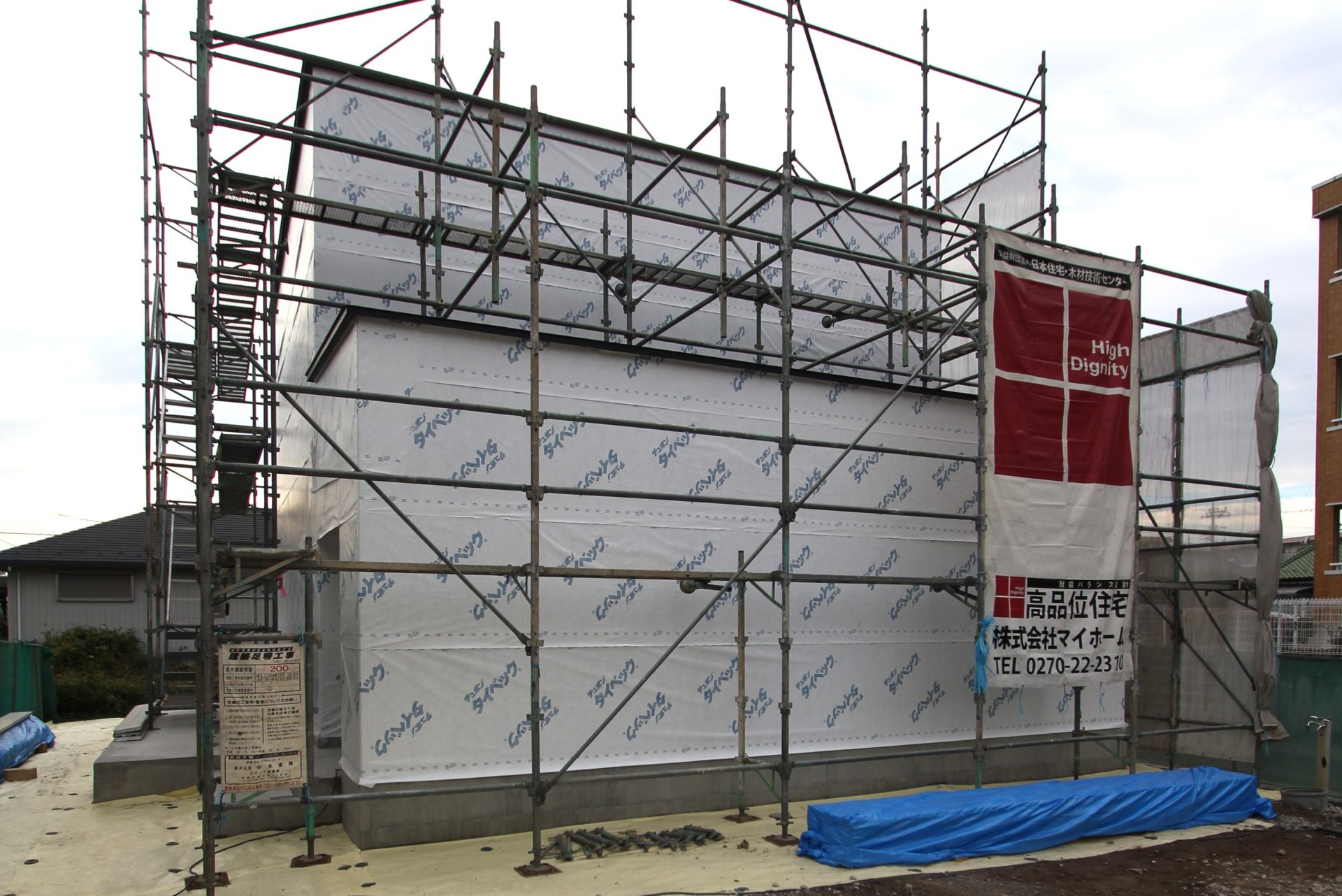 さらに今回の現場巡りから、初登場となる伊勢崎市のY様邸が加わります。すでに上棟まで終えていて、これから断熱材の施工や窓の設置へと進んでいきます。マイホームの施工例で最も人気のキューブ型で、建物全体が白の透湿防水シートで覆われているため、マイホームの懸垂幕がより目立ちます。