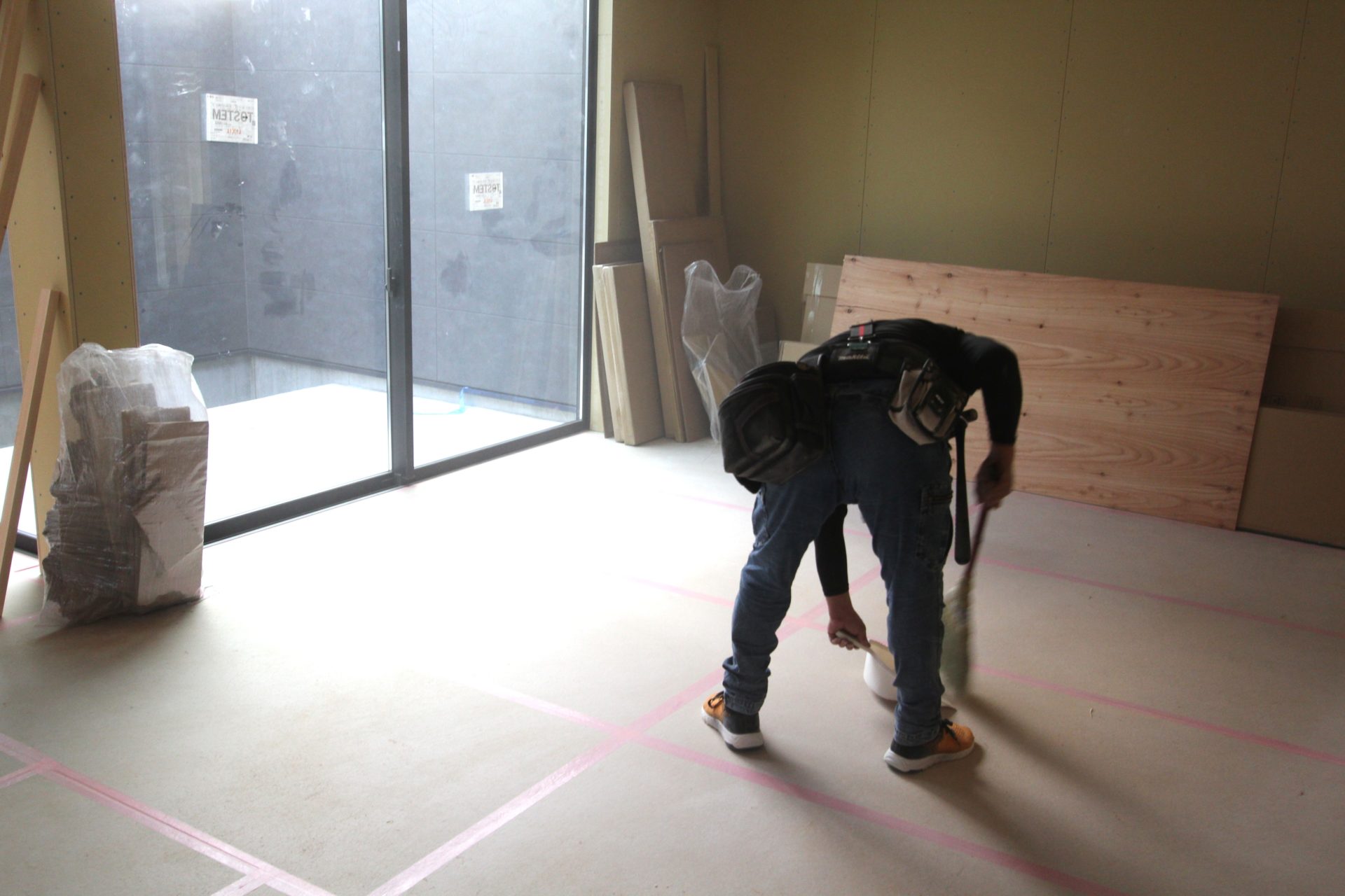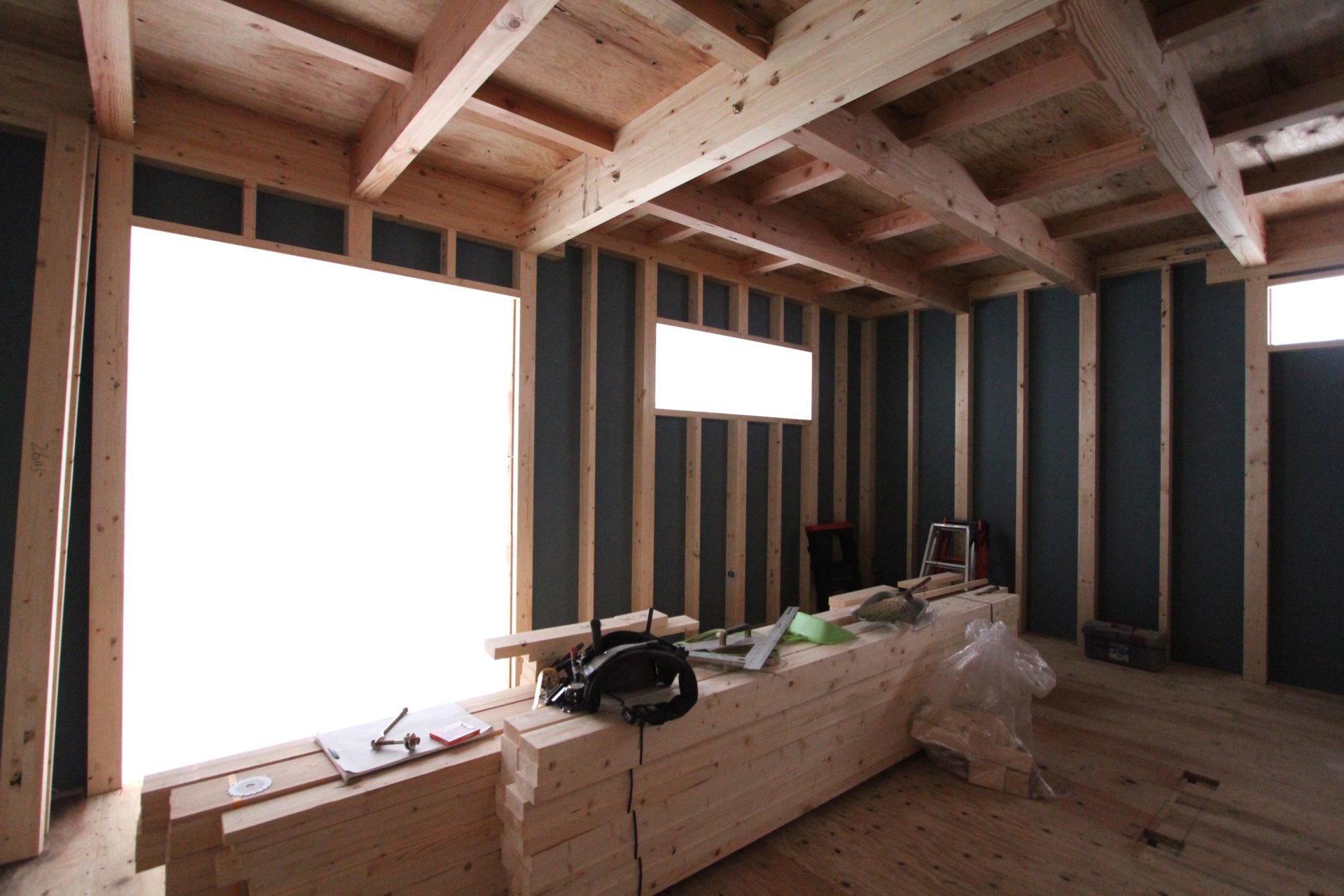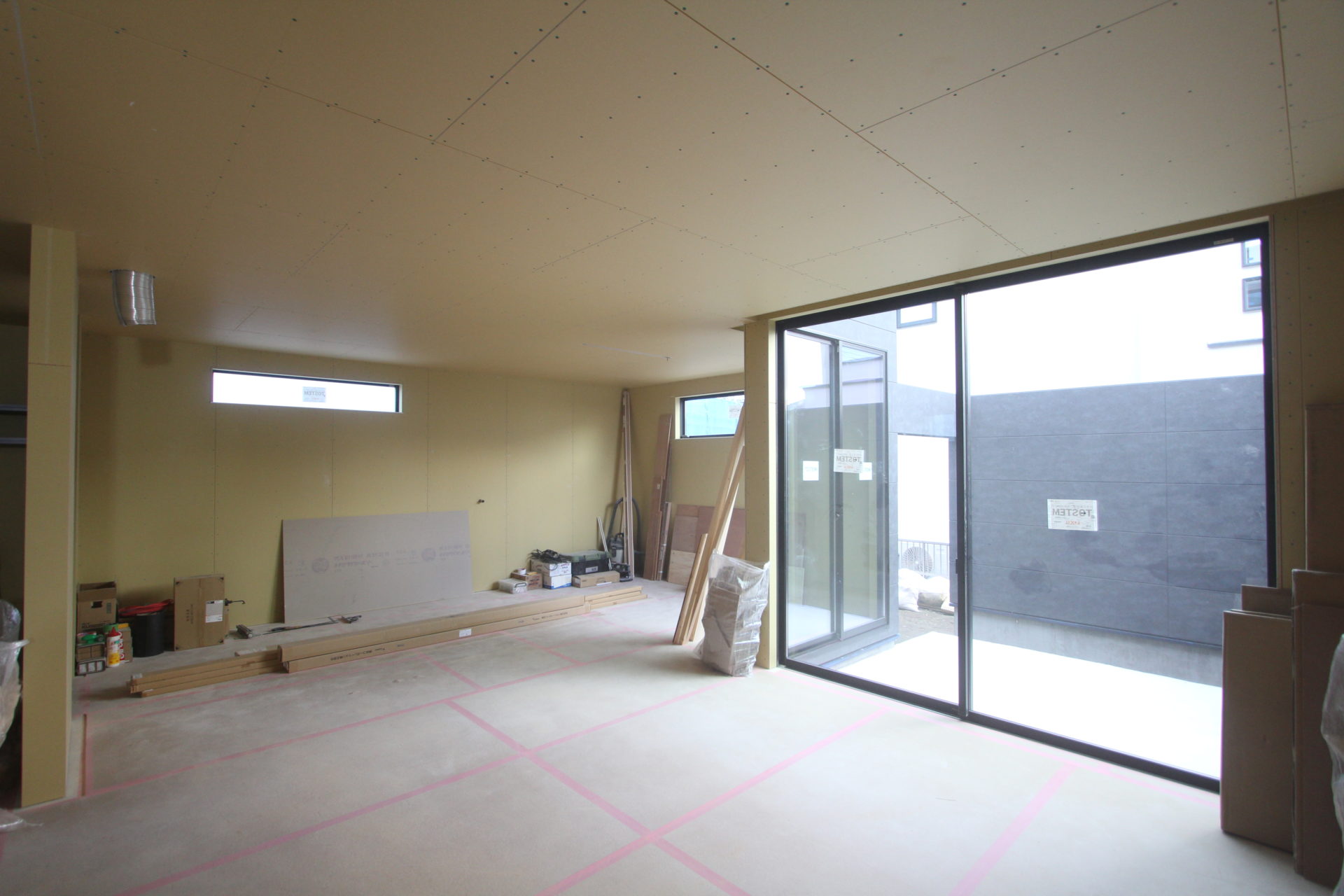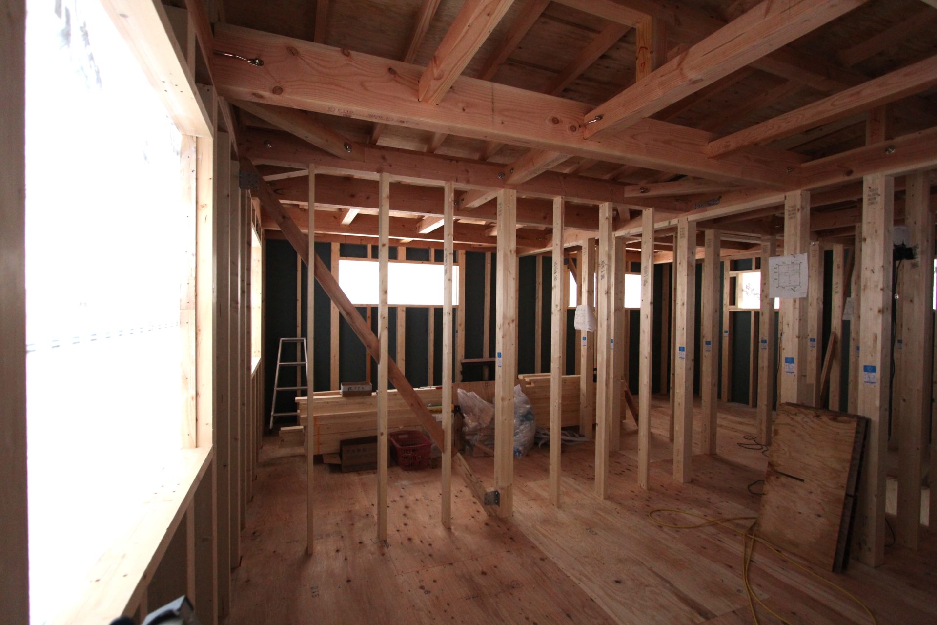室内から見たテラス。建物の形がL型になっているのが分かります。外からの人目にさらされることなく、O様のプライバシーはしっかりと守られます。天井まで高さのある、いわゆる「ハイドア仕様」の大きな掃き出し窓が、見た目にもスッキリとした印象を与えてくれますね。そして、とにかく室内がキレイです。なぜかというと、この日の作業を終えた大工さんが最後の清掃の真っ最中でした。常に現場をキレイに保つ—この意識の高さこそが「より良い家を造ろう」という想いに繋がっていくのです。さすがマイホームが選んだ大工だけありますね!