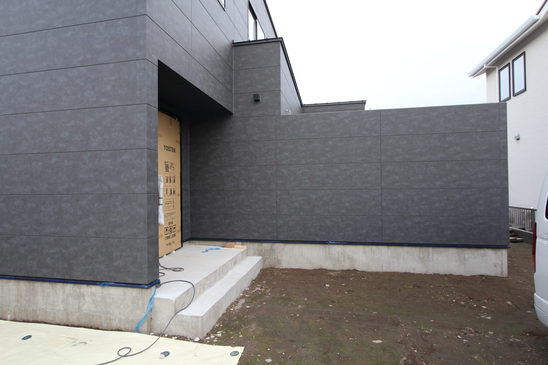 では前置きはこれくらいにして11月の現場巡り、まずは3回目となります伊勢崎市のO様邸です。前回は大きな目隠し壁に囲われたテラスをご紹介しましたが、先日伺ったところ外壁工事は完了しており、その重厚かつモダンな姿がお披露目されていました。O様邸は西道路ですが、道路側からはテラスはまったく見えません。