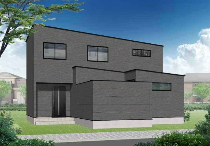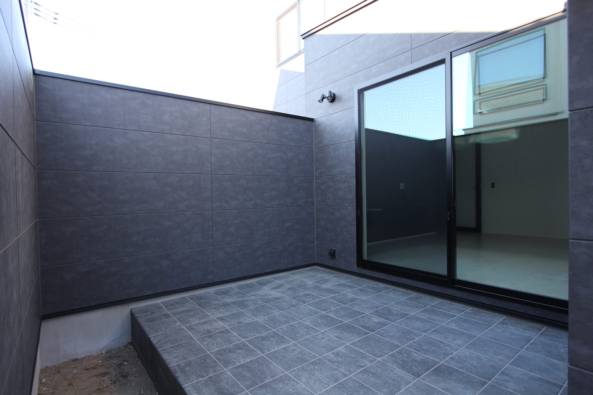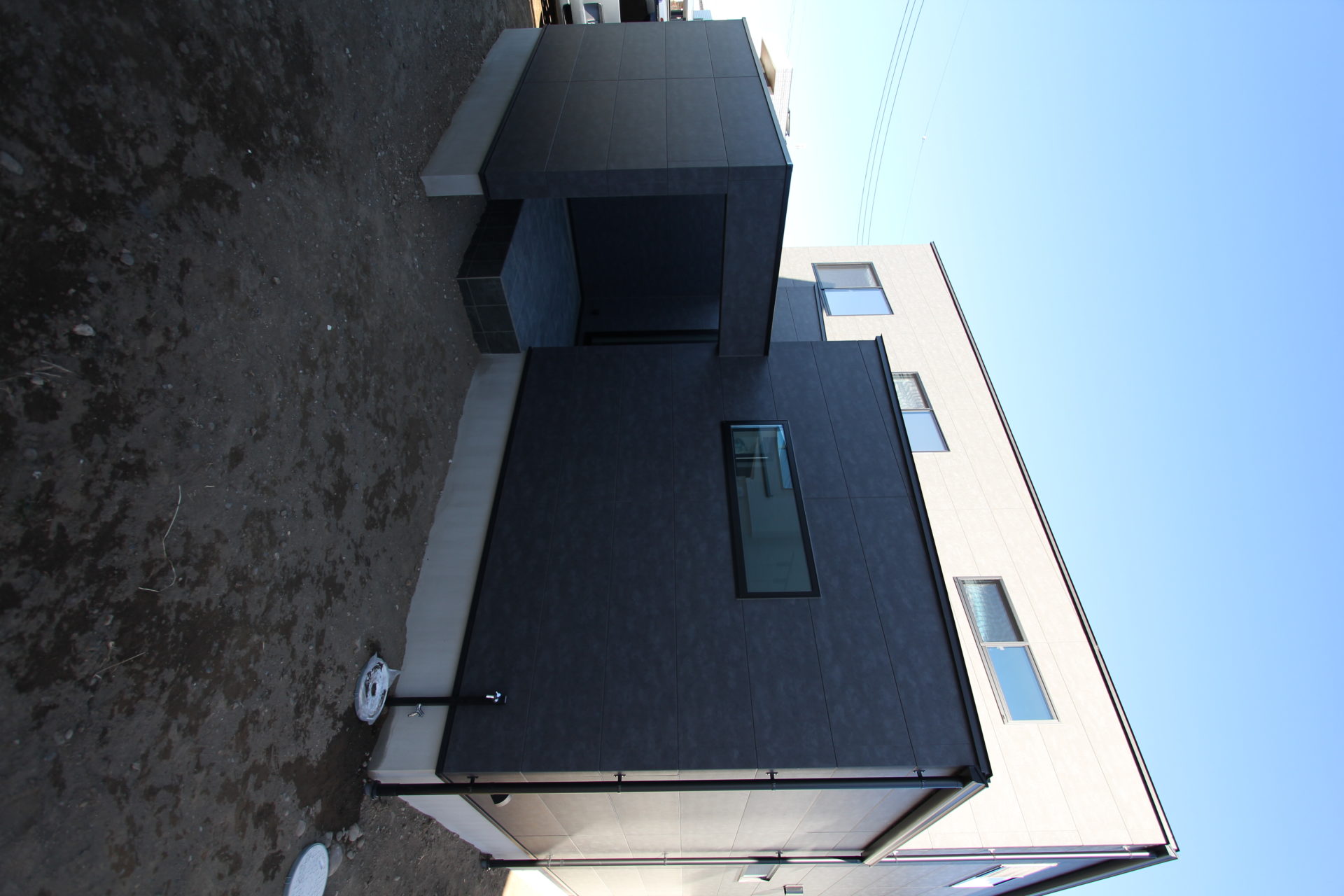 まずはさっそく外観からご紹介していきましょう。1枚目は玄関アプローチと、中庭を囲む袖壁。O様邸は西道路ですが、室内の様子が一切見えず、ご家族のプライバシーは完璧に守られています。外壁材はニチハの「メレブラック」ですが、陽の光が強すぎて素人の私では上手に撮影できず日なたの部分が飛んでしまうため、全景はパースでご容赦ください(^^;