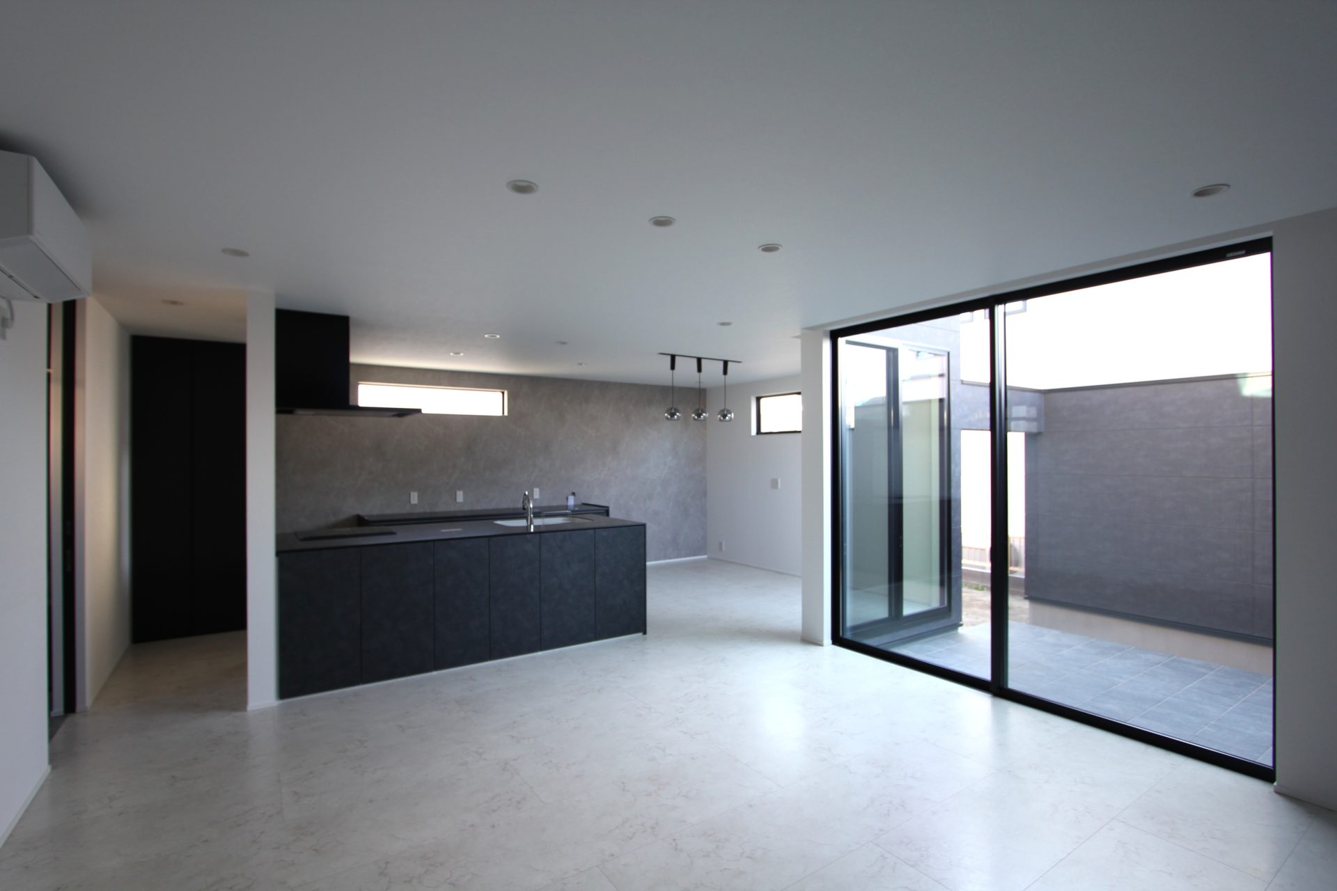 室内に移りまして、まずはLDK。床はスタイリッシュな石目調タイルで、黒のキッチンがひときわ目立ちます。そして大きな掃き出し窓は、テラスとの「繋がり」を生み出してくれるでしょう。