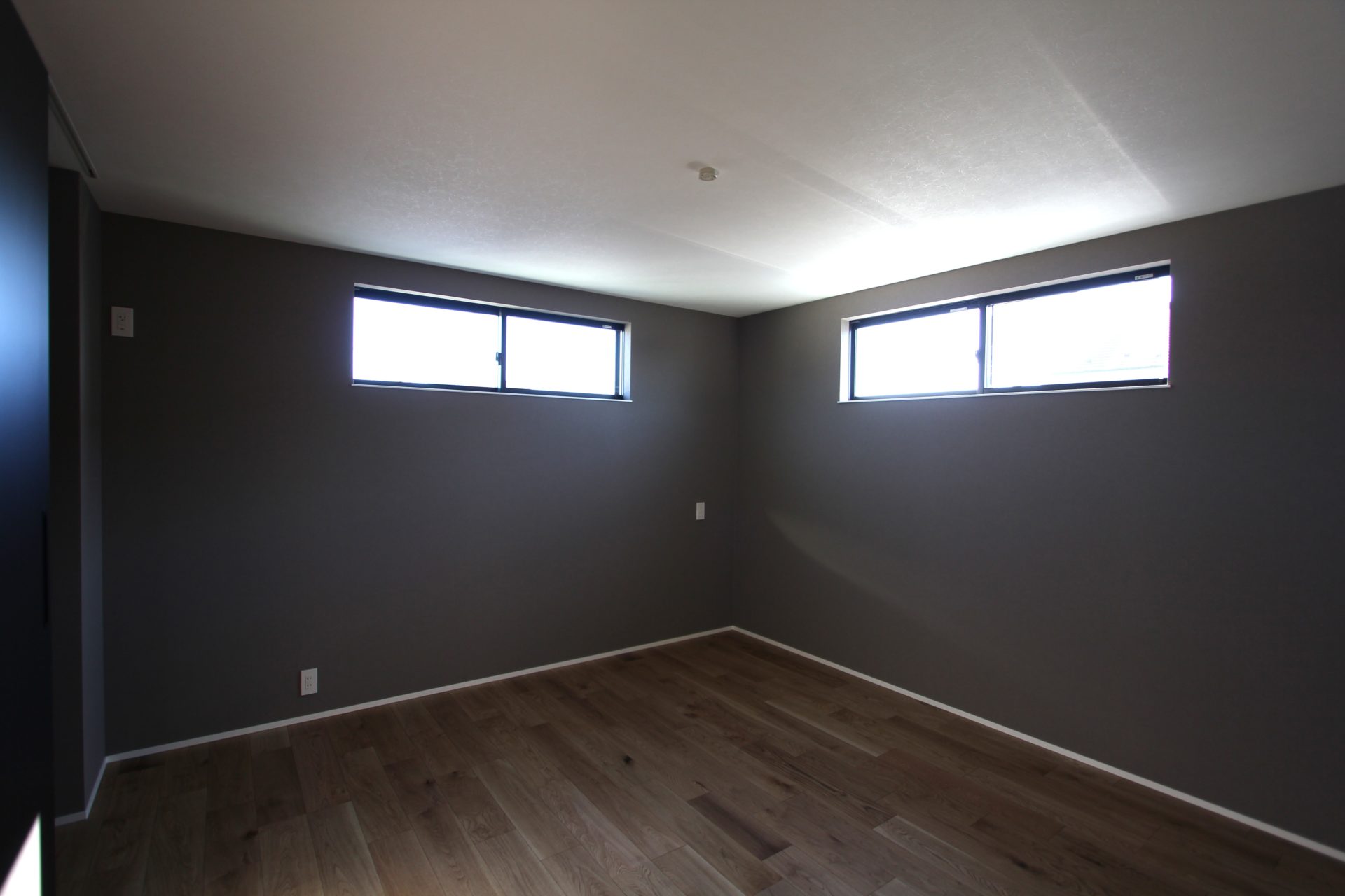 最後は2階の主寝室。窓のサイズを抑え、照明も最低限に留めるなど「寝る」ためだけに特化した空間です。床はオークの突板ですが、基本的にO様邸は白・黒・グレーのモノトーン調で統一しています。