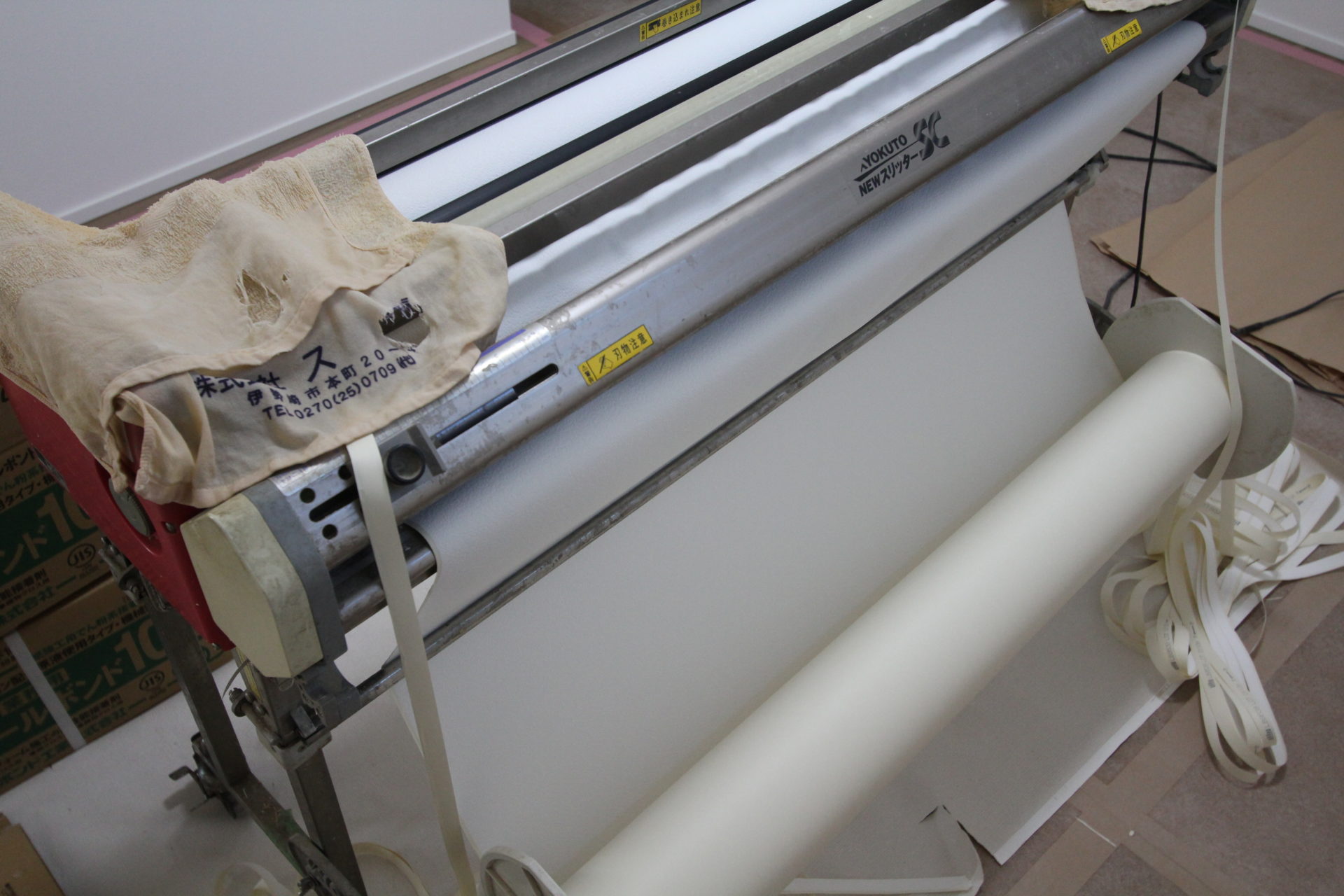 そしてこの日は、ちょうど2階の壁紙工事を行っていました。1階の主寝室に置かれているこちらの機械は「自動壁紙糊付機」。壁紙をこの機械に通して複数のローラーで挟み込み、一定の速度で前に押し出すことでムラなく均一に糊を塗布することができ、シワや歪みのない仕上がりに繋がっていくそうです。