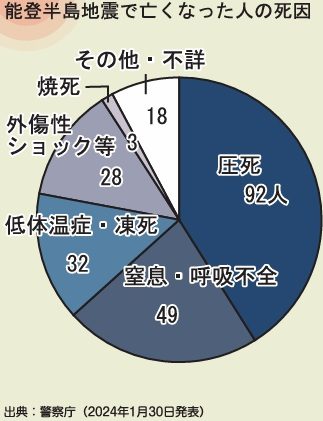 当時のテレビやインターネットによる連日の報道で、1階が無残にも圧し潰されてしまった家々を目の当たりにした方も多いと思います。特に建物への被害が大きかった輪島市や珠洲市は過疎化によって高齢者だけの住まいが増え、古い木造住宅が多く残っていたことも、被害が拡大した原因の一つとされています。また、今回の能登半島地震では、倒壊した建物の下敷きになる「圧死」が、死者数全体の約40%を占めたほか、「窒息」と「呼吸不全」が約20%。さらに建物の倒壊によって道路が寸断されたことによって救急車や消防車の到着が遅れ、救助を待つ間に「低体温症」や「凍死」で亡くなった方が約14%いたことも分かっています。