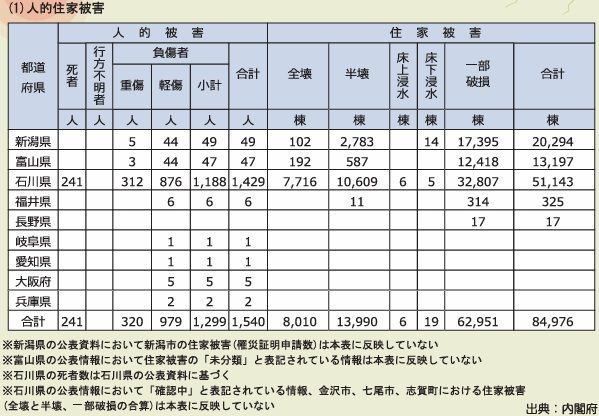 内閣府が発表した2024年3月12日時点での被害状況によれば死者は241名を数え、水道・電気・ガス・通信といったライフラインが寸断され、土砂崩れ等による道路の通行止めや、火災も17か所で発生するなど各地で甚大な被害を及ぼしました。そのなかでも「住家被害」においては、石川県・新潟県・富山県・福井県・長野県の5県における全壊は約8,000棟、半壊が約14,000棟、一部損壊も約63,000棟と、実に約85,000棟もの住宅が被害を受けているのです。