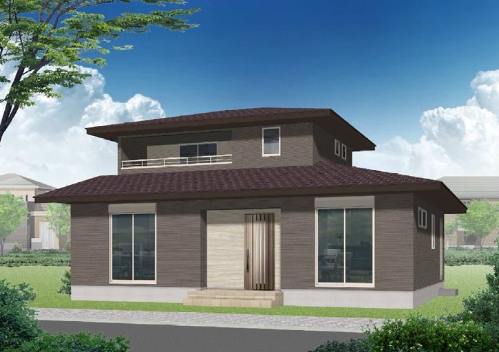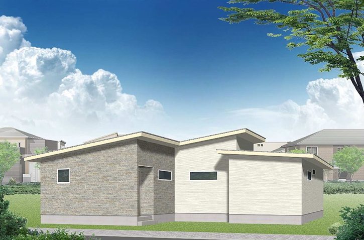 こちらもまたマイホームの超自由設計だからこそ可能になった個性あふれるフォルムといえるでしょう。平屋をベースに、まるで越屋根のような2階部分、そして2階に繋がる片流れ屋根は室内の天井高を生み出すためでもあります。大きな掃き出し窓に面したテラスにはしっかりと軒も掛けられており、デザイン性を追求すると同時に高い実用性も備えています。上のI様邸と同様に非常に間取りが気になるところです。