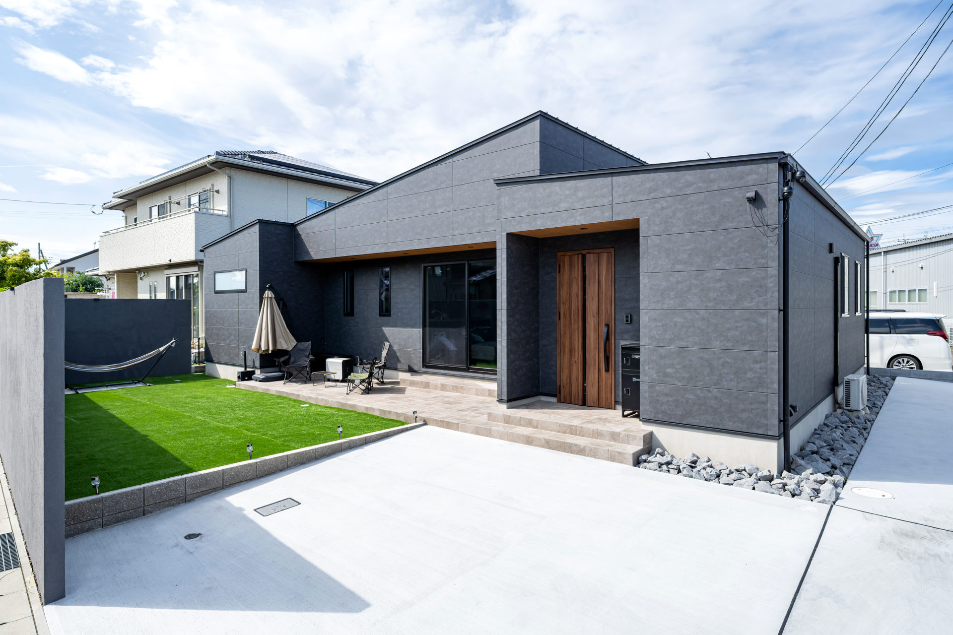 O様が「汚れが目立ちにくくて、見た目にもカッコいいから」とチョイスしたグレーの外壁。LDKの天井を高く設計するために採用した片流れ屋根も、さらにデザイン性を引き立てています。アクセントになる木目柄の玄関扉に加えて、道行く人と車から庭や室内が丸見えにならないよう大きな目隠し壁を立ち上げている点も特長の一つです。