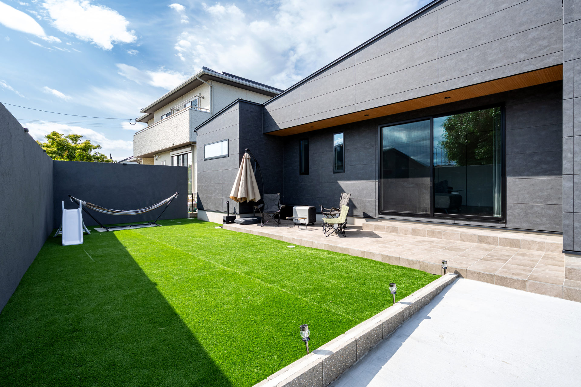滑り台にハンモックと、お子さんたちの格好の遊び場として重宝されている人工芝を敷いた庭に、「休日の朝にゆったり過ごしたい」というOさんの夢を叶えた二段構えのタイルデッキ。