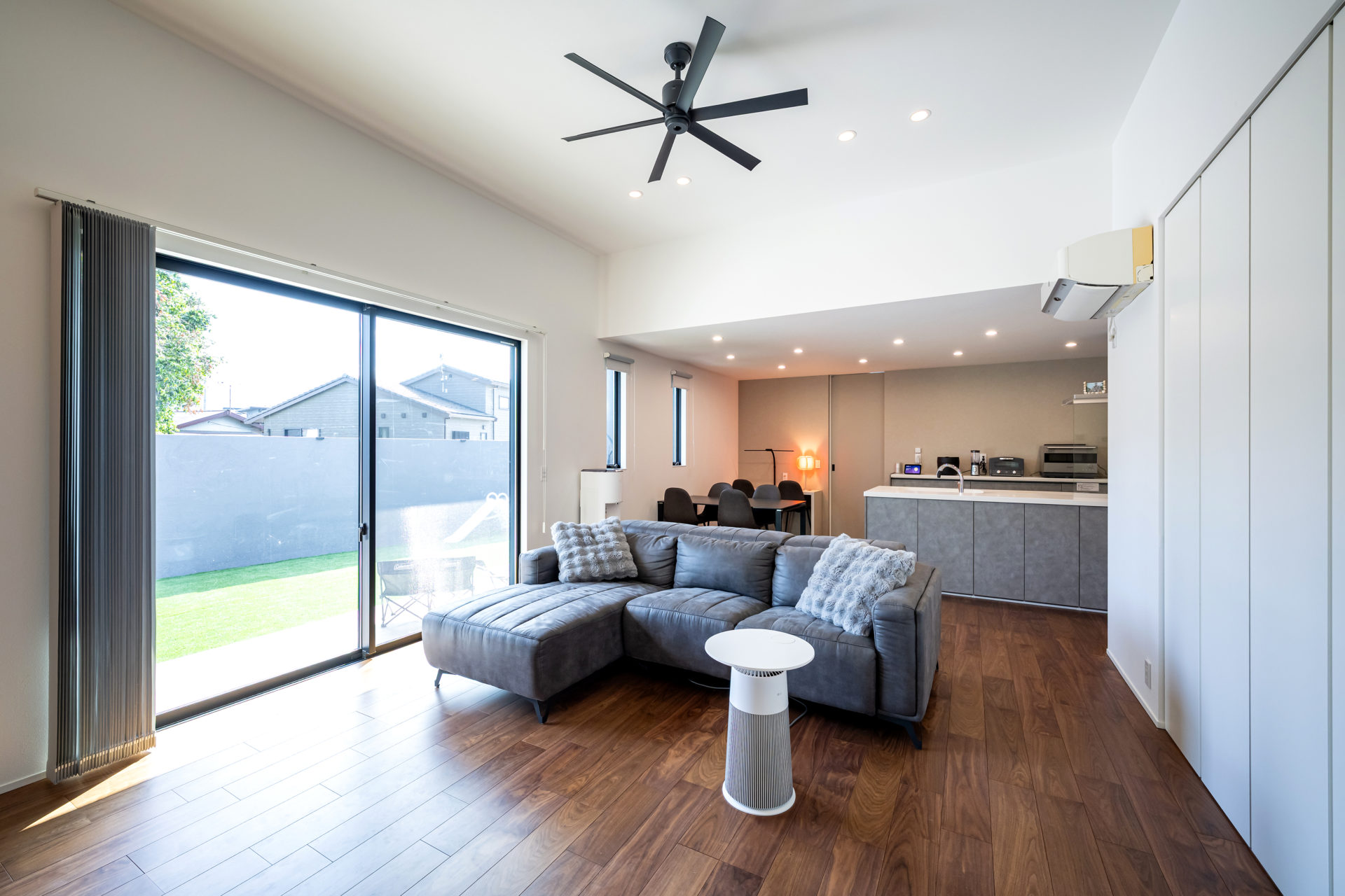 限られた延床面積(35坪)でも可能な限りスペースを割いた、こだわりのLDK。勾配天井のほか大きな掃き出し窓から外部と繋がることで、より空間としての広がりや開放感が得られるでしょう。ダイニングにはお子さんのためのスタディーカウンターを併設しており、奥様がキッチンで料理中でも気軽に声が掛け合える「丁度いい」距離感が魅力です。