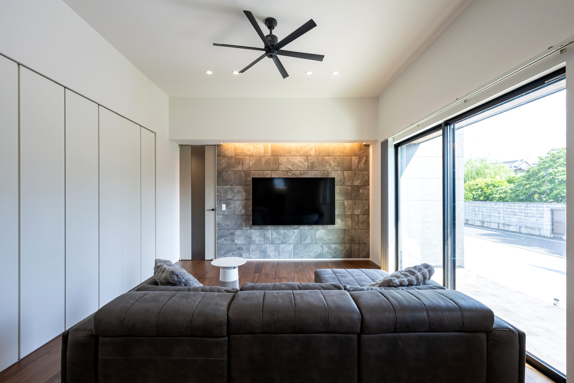 石張り調タイル「エコカラット」に間接照明を組み合わせることで非日常感を演出したリビング。大きな収納棚も「取っ手レス」かつ色も統一することで、悪目立ちせず壁に溶け込んでいます。