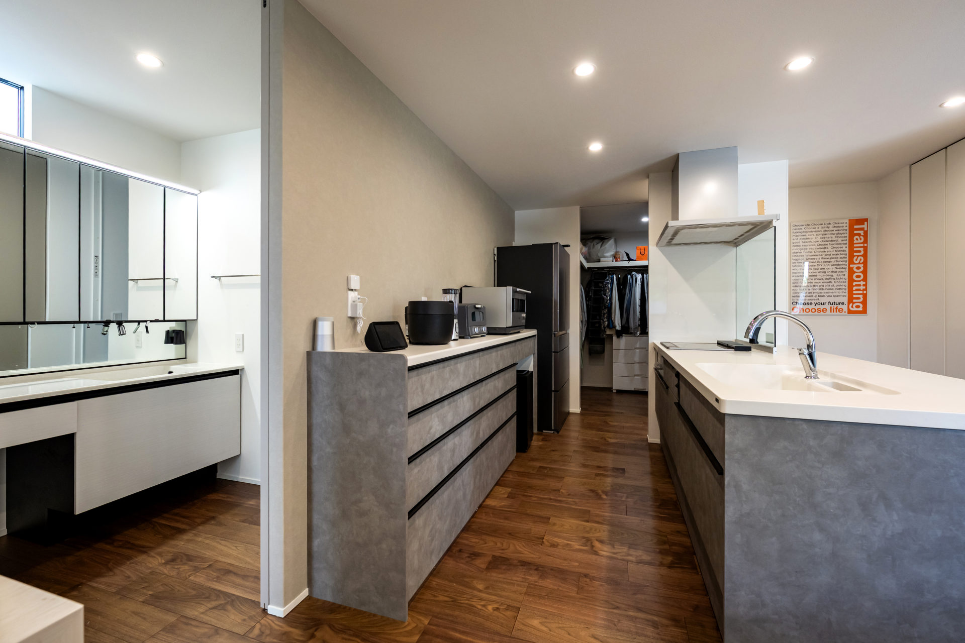 寝室からL型のウォークスルークローゼットを経てキッチンへ続く回遊動線。さらに西側にはホテルライクな雰囲気が味わえる洗面化粧台や、南向きで陽当たりの良いランドリールームが隣接。ご覧のように水廻りをコンパクトにまとめることで奥様の家事時間の短縮に大きく貢献しています。