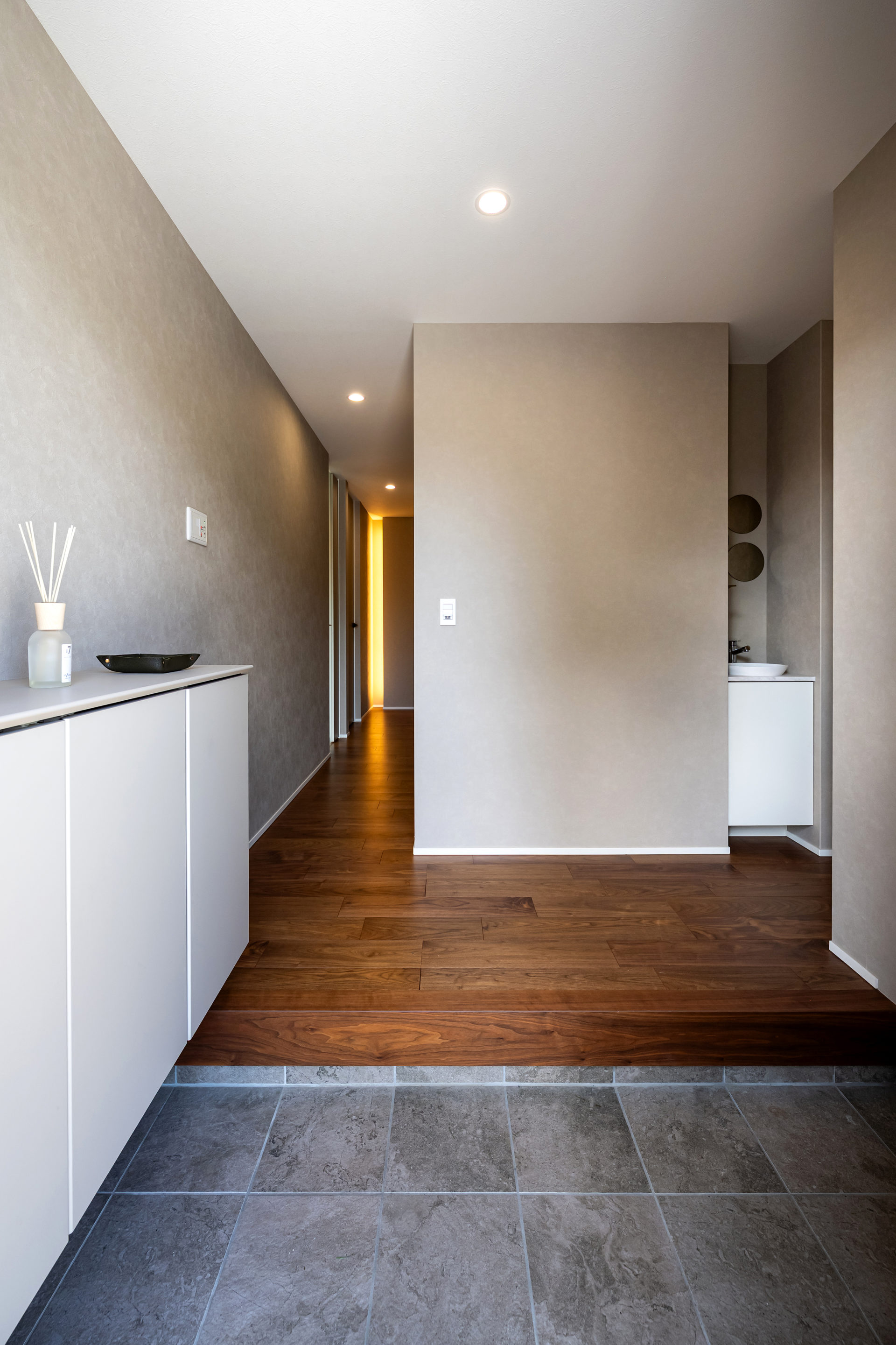 邸内は白・グレー・木目でカラーリングしており、それは玄関ホールも同じ。さらにライティングにも力を入れており、「明るさ」よりも間接照明を多用して「落ち着き」や「安らぎ」を重視しています。